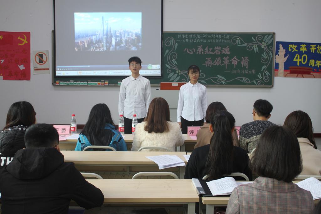 为缅怀革命先烈,让党员们深入学习红岩精神,同时为纪念改革开放四十周年,财富管理学院学生党支部于2018年11月16日下午14:00在教学楼1613教室组织召开了“一一·二七”暨“纪念改革开放四十周年”朗诵比赛和海报展示系列特色活动。
