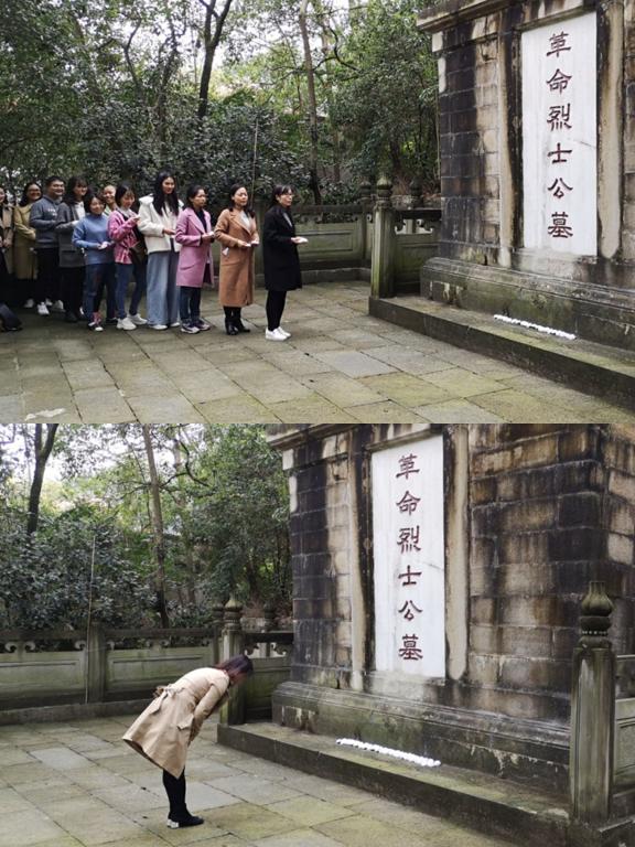 当日下午,全体成员抵达陵园,怀着对革命先烈崇敬之情,在陵园正气亭回顾了中国人民解放军第二野战军12军35师103团在南温泉战斗中浴血奋战的光辉历史和先辈英烈们“捐躯赴国难”的英勇事迹。接着,党员同志们排着整齐的队伍,肃立在革命烈士纪念碑前,教师党支部书记吴玉梅同志致辞后,全体党员默哀,表达对先烈的敬重与哀思。之后,全体党员在姚转花副书记的带领下郑重举起右手庄严宣誓,重温入党宣誓时的庄严承诺。最后,党员师生来到先烈们的墓碑前,依次向烈士们鞠躬致敬,敬献小白花,悼念革命英雄,追思革命先烈们的丰功伟绩