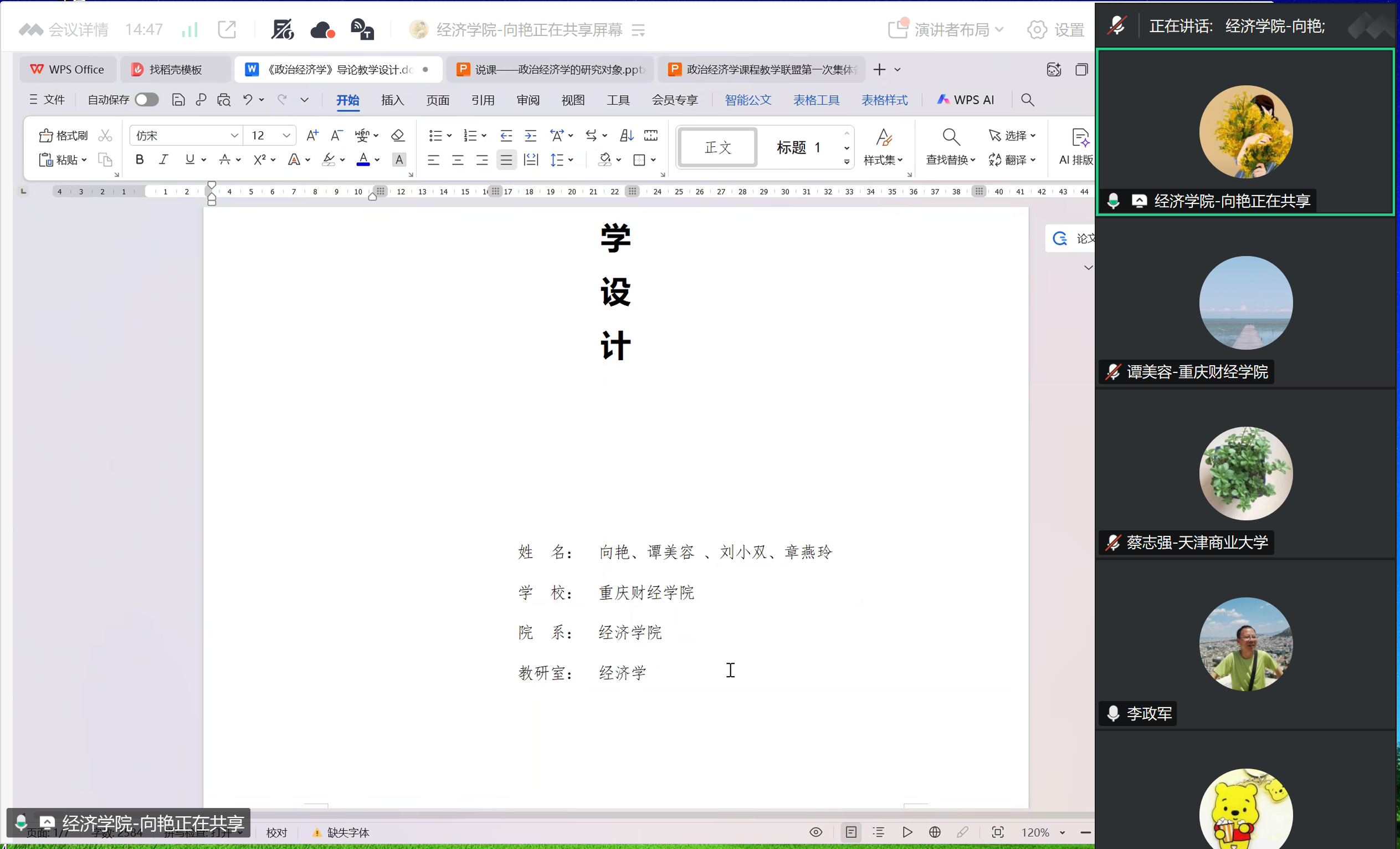最后,李政军教授总结指出,今天的备课会达成一个共识,那就是在有限课时内,“导论”教学应聚焦于马克思主义政治经济学的研究对象和目的,并以唯物史观为统领框架进行讲解,这是整合碎片化知识、区别于中学教育、避免教学教条化的关键。另外,本次备课会务实而高效,跨地区、跨学校整合了不同高校的集体智慧,为我校政治经济学课程“导论”教学提供了清晰的方法论与内容重点,为我校政治经济学课程教师教育教学能力提升提供了新的学习机会和新的学习平台。