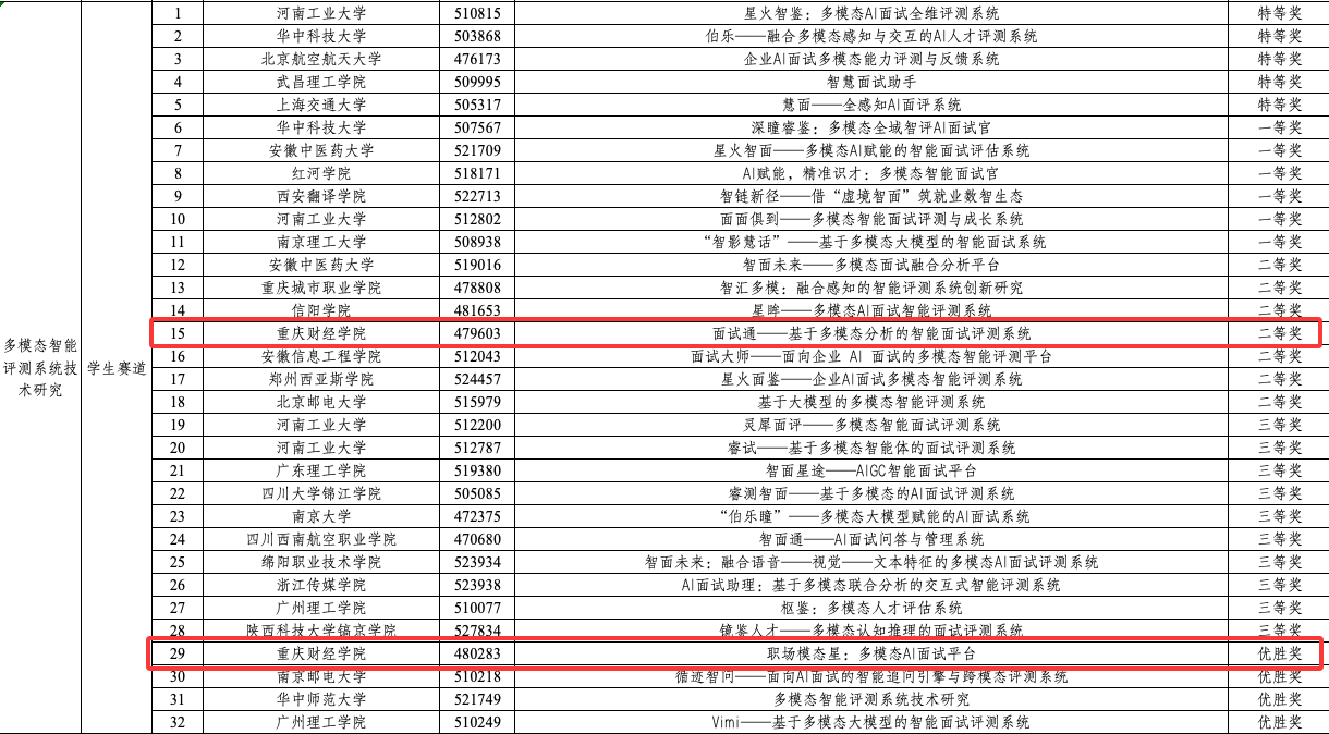 由我校讯飞人工智能郭海龙、张鑫、郑舒畅同学组成的团队带来的“面试通——基于多模态分析的智能面试评测系统”表现突出,该团队与国内顶尖高校的参赛队伍同场竞技,最终凭借精准的技术定位、扎实的科研功底和创新的解决方案,与北京邮电大学、西安交通大学、华中科技大学等重点高校一同站上国家级“二等奖”的领奖台,充分展现了我校学子在人工智能领域与顶尖高校学子同台竞技、齐头并进的强劲实力。另一项目由陈代鑫、陈雨杰、封玲菲同学研发,“职场模态星——多模态AI面试平台”同样表现出色,获得“优胜奖”。该系统支持实时问题识别、岗位定制题库生成及多场景面试模拟,其双端协同模式与企业信息整合功能,其商业化价值获得评委高度认可。
