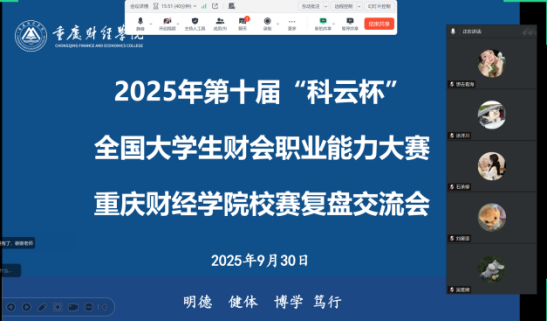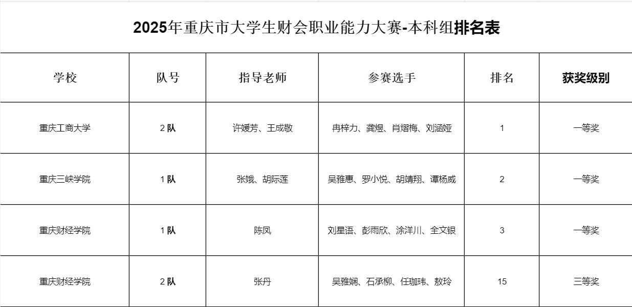 捷报!在近日落幕的2025年重庆市“科云杯”大学生财会职业能力大赛(本科组)中,重庆财经学院代表队从包括西南大学、西南政法大学等多所高校的激烈竞争中脱颖而出,实现历史性突破。本次大赛吸引了全市30余所高校的60余支队伍同台竞技。其中,由陈凤副教授指导的1队(刘星语、彭雨欣、涂洋川、全文银)荣获一等奖(总排名第3),由张丹老师指导的2队(吴雅娴、石承柳、任珈玮、敖玲)荣获三等奖(总排名第15)。这一成绩实现了我校在该项赛事中近五年来的奖项“零突破”,标志着我校财会类专业学科竞赛水平迈上新台阶。