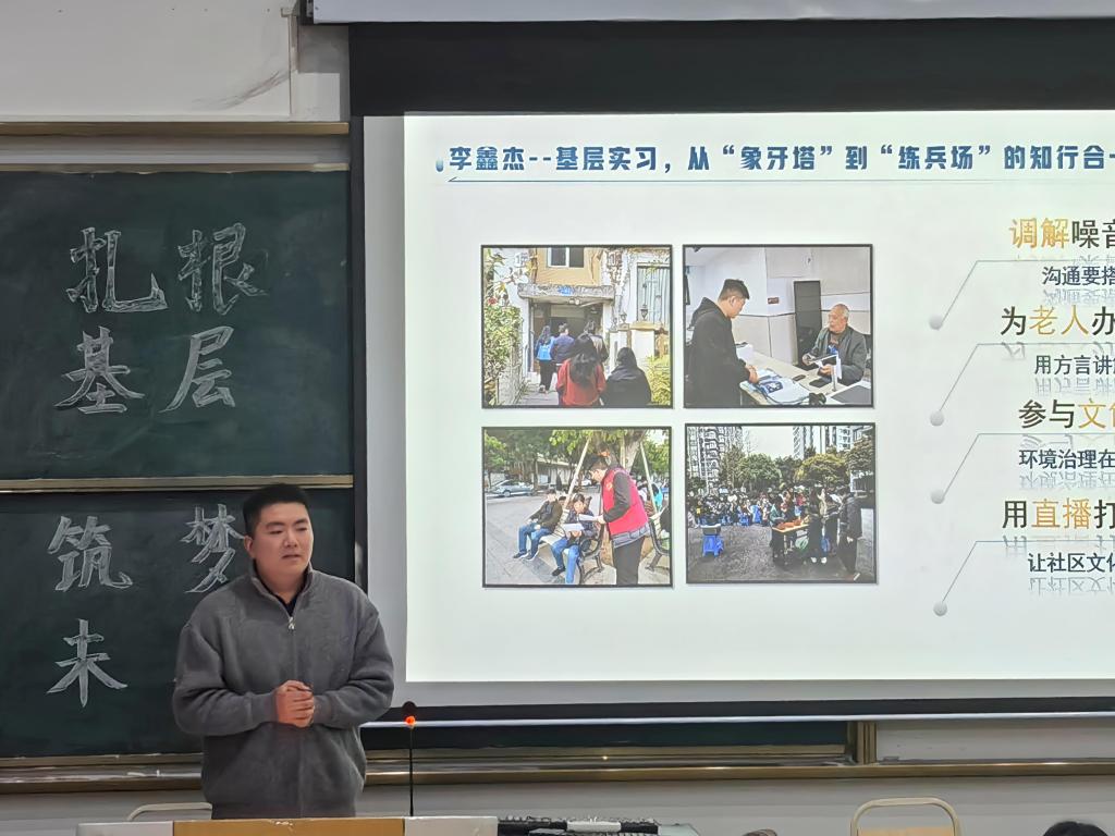 在经验分享环节,五位2025届基层就业优秀学生代表依次发言。他们结合工作实例,生动还原了基层实践中的角色定位与能力成长:从“政策宣传员”的政策解读技巧,到“民情联络员”的群众沟通艺术,再到“服务代办员”的应急事务处理经验,全面展现了基层工作对综合素养的锤炼价值。