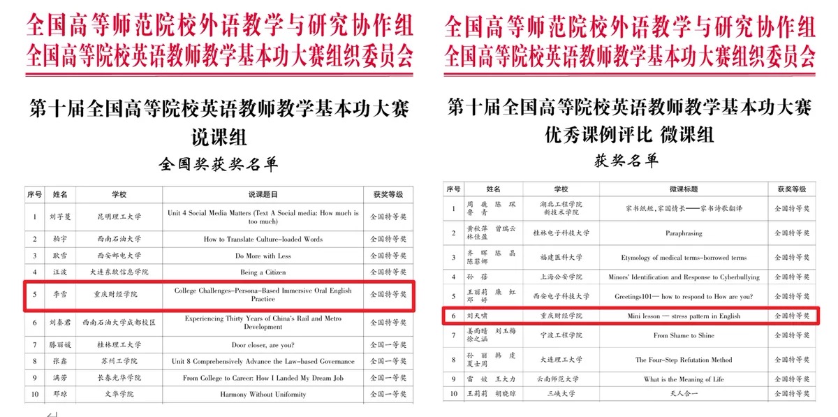 10月26日,第十届全国高等院校英语教师教学基本功大赛在江苏南京落下帷幕。我校通识教育学院积极备赛、有力组织,遴选出2位选手参赛,双双斩获全国特等奖,实现了学校在该项赛事上的全国一等及以上奖项三连冠,并再次实现了学校教师教学技能竞赛的历史性突破。