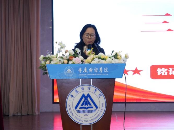 接着,马克思主义学院院长常晓薇作了重要致辞。她指出,在中国人民抗日战争暨世界反法西斯战争胜利80周年的重要节点,习近平总书记“铭记历史、缅怀先烈、珍爱和平、开创未来”的重要论述,为传承红色基因、深化思政育人指明了方向。在此背景下,举办第十三届“大思政课”活动,有助于将抗战历史教育与思政育人深度融合。常院长还回顾了马克思主义学院多年深耕思政教育的丰硕成果,如思想政治理论实践课获批重庆市一流本科课程,三个课堂联动育人案例入选市级一流本科课程案例,学生作品斩获教育部“我心中的思政课”全国大学生微电影比赛优秀奖,“大思政课”数字地图获教育部收藏等荣誉。这些积淀让思政教育走出课堂、浸润心灵,将红色基因植入青年血脉,为学校获评大中小学思政课一体化建设组长单位筑牢根基。常院长强调,思政教育是国之大计、党之大计,我们应当以“大思政课”活动为纽带,高举伟大抗战精神的火炬,传承红色基因,厚植家国情怀,让青春在为强国建设、民族复兴的不懈奋斗中绽放绚丽之花!