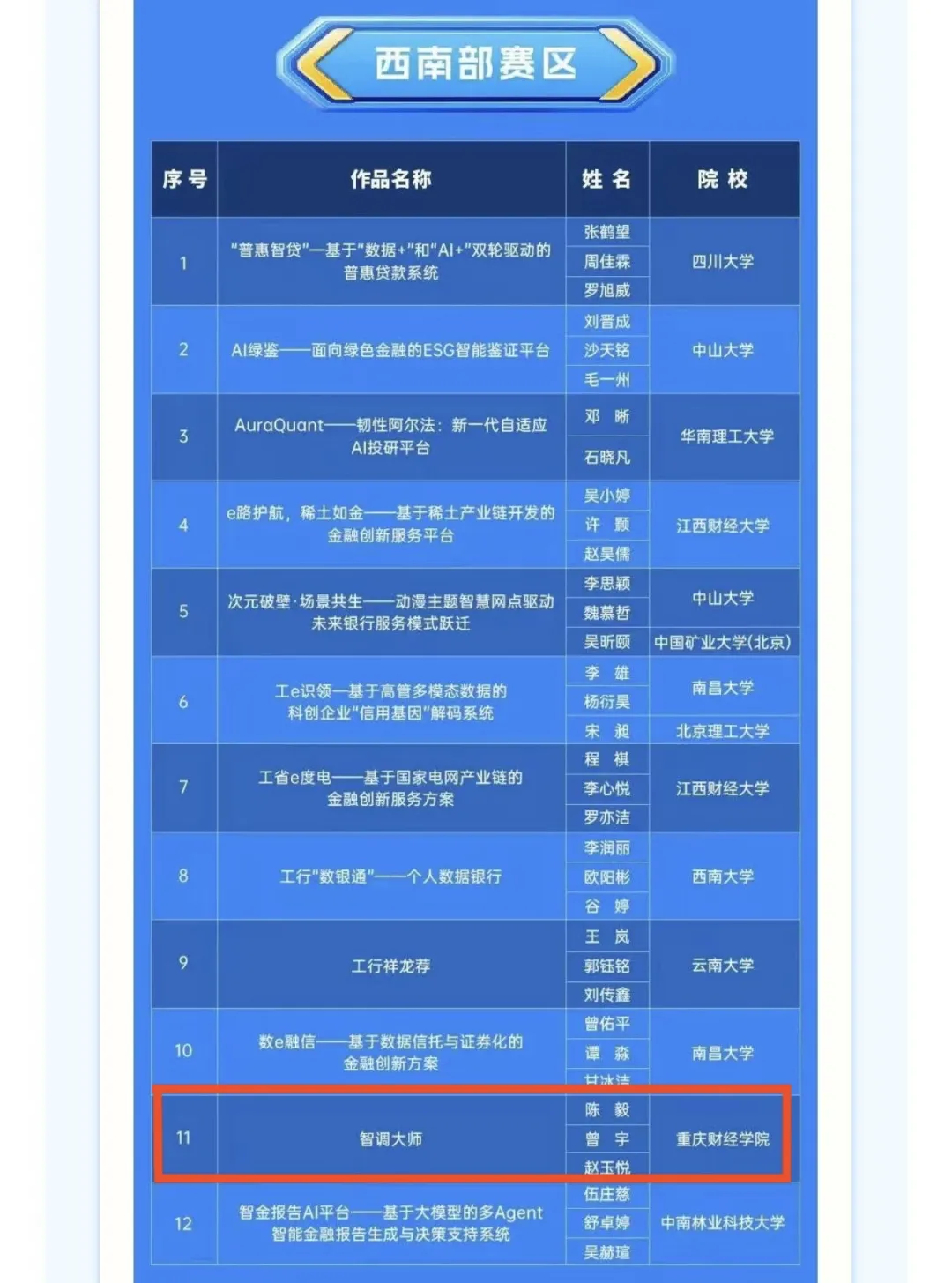 在这场“高手如云”的竞技中,重庆财经学院金融学院学生团队聚焦金融科技前沿,以敏锐的行业洞察力和扎实的技术功底,一路过关斩将,成功突围。入围全国区域赛的高校总共有48支队伍,其中有80%的队伍来自“985”“211”,而我校是唯一一所民办高校代表!这一突破,充分彰显了我校在金融创新领域的强劲潜力与非凡实力!