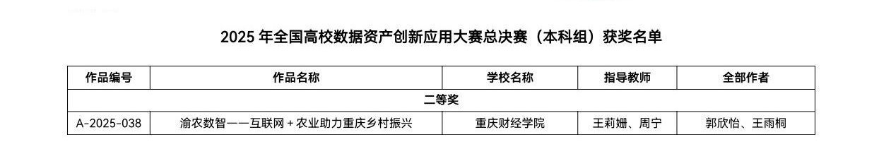2025 年11月15日,由中国商业会计学会主办、中国商业会计学会数据资产分会承办、北京知链科技有限公司提供技术支持的“2025 全国高校数据资产创新应用大赛总决赛”圆满落幕。我校经济学院 24 经济一班郭欣怡、王雨桐同学的作品《渝农数智互联网+农业助力重庆乡村振兴》,历经市赛突围与国赛激烈角逐,成功斩获全国二等奖。这是我校首次在该项全国赛事中收获奖项,一举实现学校在该领域全国性赛事获奖的“零突破”,充分彰显了经济学院聚焦应用型人才培养、深化“课赛融合”的育人成效。