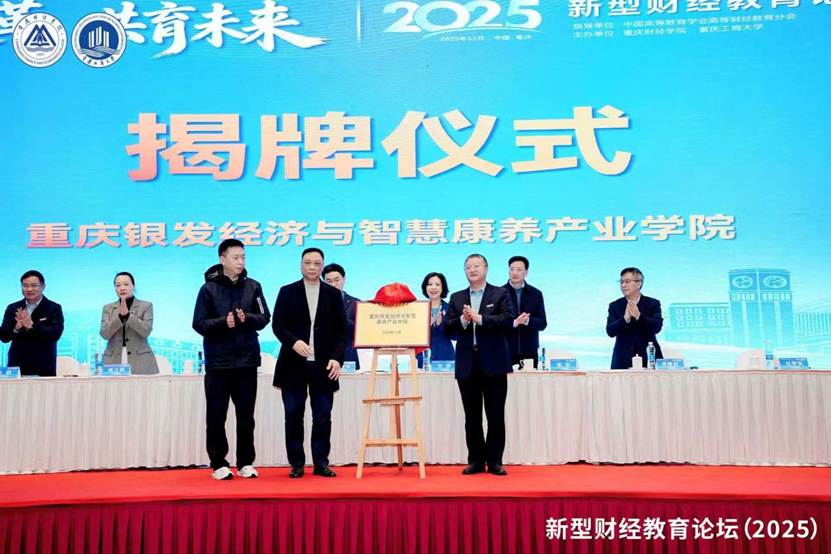 开幕式现场,重庆市养老服务协会郭恒良常务副秘书长,重庆财经学院吴华安校长,重庆宏善实业集团有限公司杨沛副总裁为“重庆银发经济与智慧康养产业学院”揭牌,标志着重庆财经学院在深化产教融合、推动新财经与新工科、新文科交叉融合方面迈出坚实步伐。