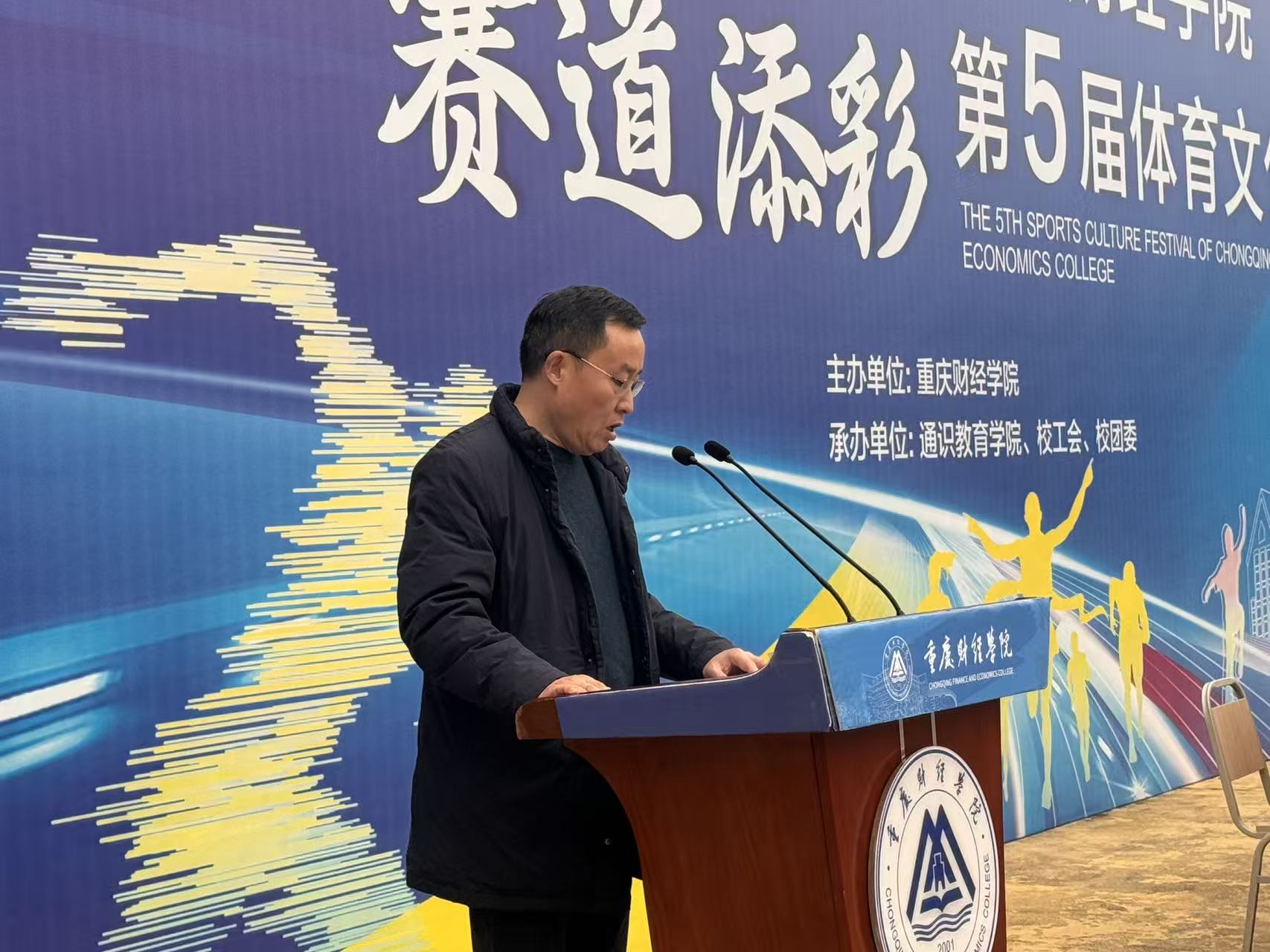 随后,李春雷副校长致闭幕辞。他首先代表学校向为本届体育文化节成功举办付出辛勤劳动的全体裁判员、工作人员、志愿者,以及积极参与的全体师生表示衷心感谢。李春雷指出,本届体育文化节不仅是学校贯彻“五育并举”教育方针、深化体育教学改革的重要体现,更是展示重财学子昂扬精神风貌、增强集体荣誉感与凝聚力的盛大舞台。赛事期间,同学们在赛场上挥洒汗水、奋力拼搏,展现了出色的运动技能、良好的体育道德和坚韧的意志品质,真正赛出了风格、赛出了水平。他希望全校师生能将体育文化节中激发出的团结协作、勇于争先、永不言败的精神,转化为学习和工作的强大动力,以更加饱满的热情和强健的体魄,共同推动学校各项事业蓬勃发展。