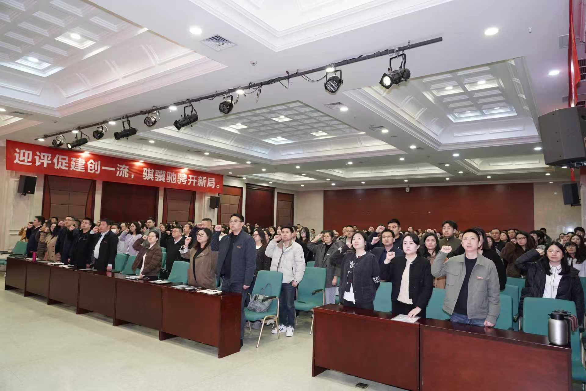 本次大会共五项议程。副校长崔中山首先通报学校合格评估推进情况并部署六大以评促建任务。教务处处长李红平、物流工程学院院长刘岱、软件学院教师王莉莉、会计学院辅导员杨秋菊分别代表职能部门、二级学院、一线教师和辅导员立足岗位和职责作发言,表态度、有温度、展力度,表达了全校教职工同心迎评的信心和决心,彰显了重财人的担当,抒发了重财人的情怀,激发了重财人共创“中国一流新型财经大学”的斗志,并一致庄严承诺:将以主人翁的姿态,将个人事业融入学校发展,用实干实绩为共同美好的明天贡献力量。