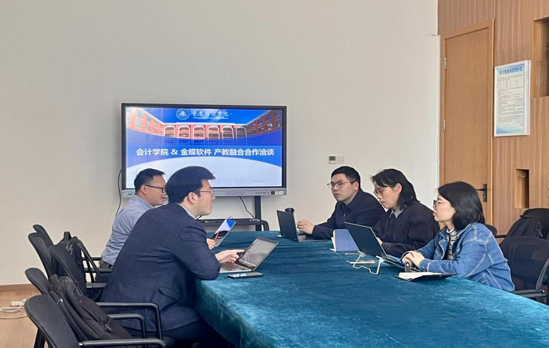 2026年3月10日下午14:30,会计学院与金蝶软件(中国)有限公司产教融合专题研讨会在图书馆大研讨室顺利举行。重庆财经学院副校长陈旭教授,会计学院副院长鲍晓敏、院长助理韩佳佚,金蝶软件(中国)有限公司项目管理部总监何浏阳、重庆分公司企业客户销售经理韩汝阳出席会议。会议围绕财会领域人才培养、教师实践能力提升及校企合作模式创新展开深入探讨,为后续深化产教融合、构建协同育人体系奠定了坚实基础。