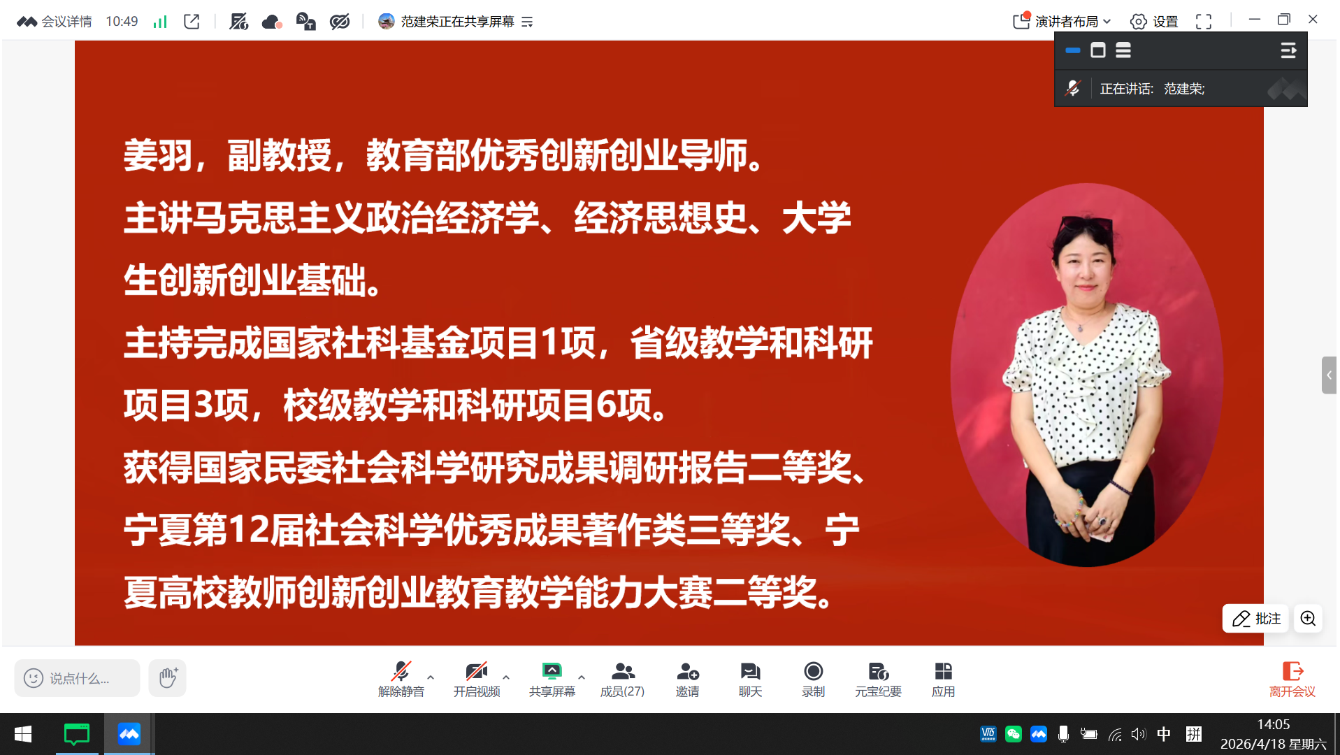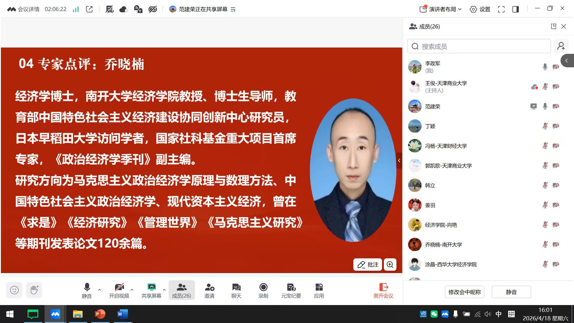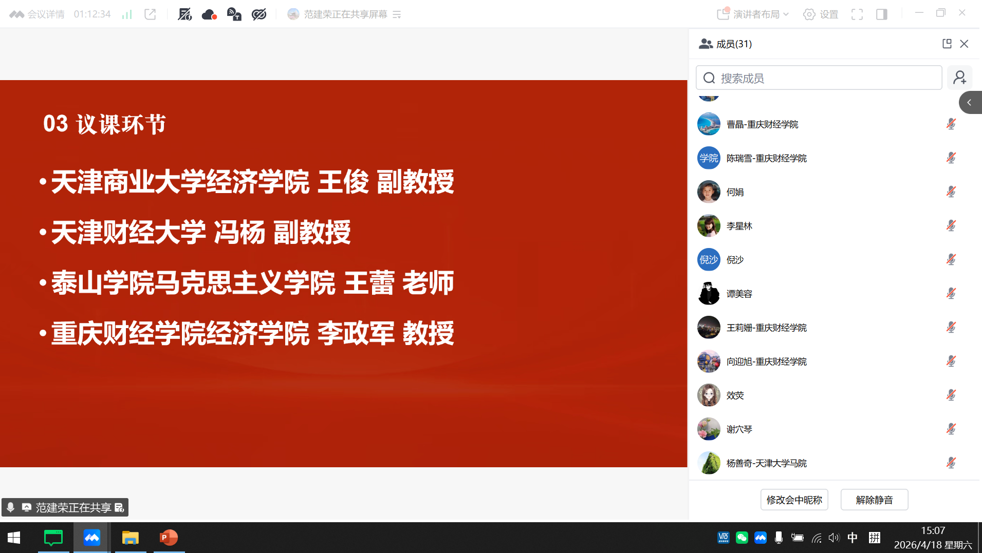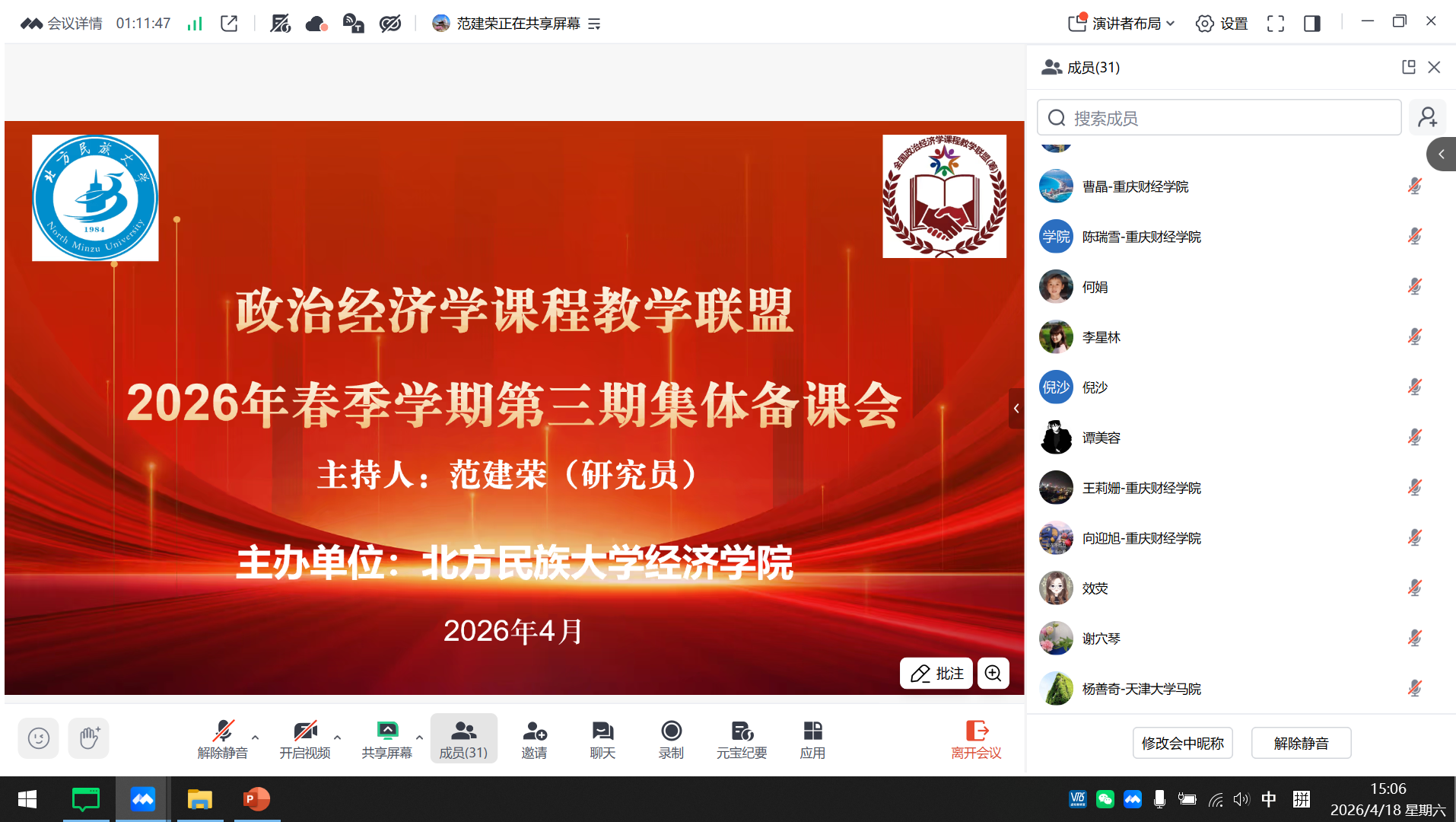 4月18日,由重庆财经学院市级经济学课程群虚拟教研室联合发起的2026年全国春季学期政治经济学第三次集体备课会在线上顺利举行(腾讯会议:37-479-639)。本次备课会由北方民族大学承办,聚焦马工程《中国特色社会主义政治经济学》教材中“中国特色社会主义分配制度”章节教学。来自南开大学、天津大学、中南大学、天津财经大学、天津商业大学、天津师范大学、北方民族大学、宁夏大学、泰山学院、重庆财经学院等20余所高校的30余位政治经济学任课教师齐聚云端,围绕教学重难点突破、案例教学实践和跨校协同育人等议题展开深入研讨。会议由北方民族大学范建荣老师主持,我校市级经济学课程群虚拟教研室负责人李政军教授及经济学教学团队教师全程参加。