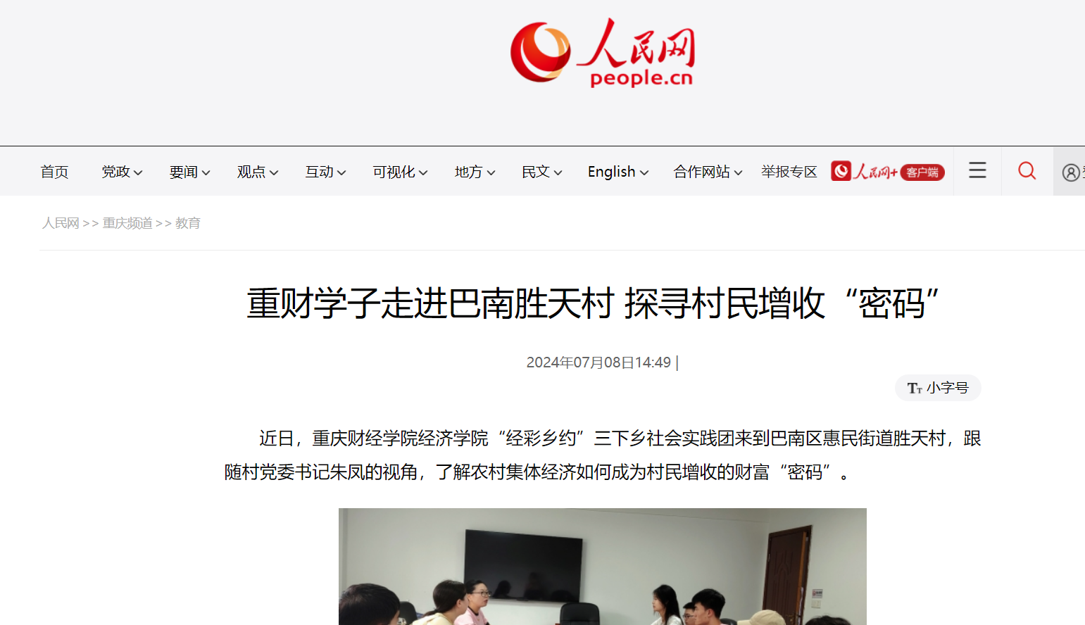近年来,随着国家乡村振兴战略的深入实施,农村集体经济的发展成为推动农村地区经济增长的重要力量。7月4日,重庆财经学院经济学院三下乡“经彩乡约”社会实践团,走入巴南区惠民街道胜天村与村党委书记朱凤进行交流。