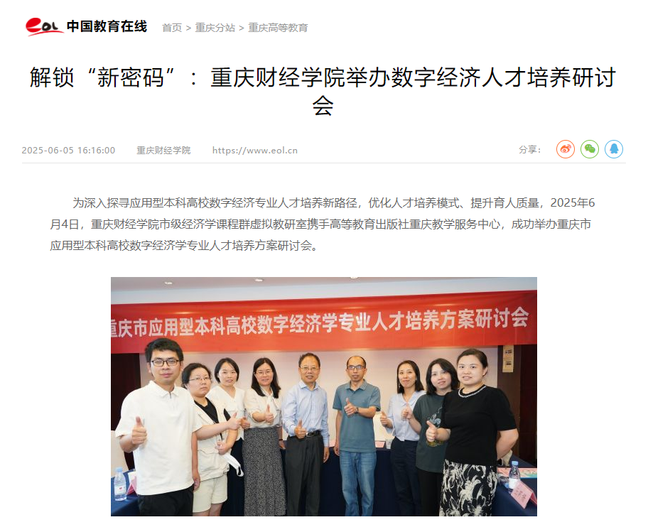 为深入探寻应用型本科高校数字经济专业人才培养新路径,优化人才培养模式、提升育人质量,2025年6月4日,重庆财经学院市级经济学课程群虚拟教研室携手高等教育出版社重庆教学服务中心,成功举办重庆市应用型本科高校数字经济学专业人才培养方案研讨会。