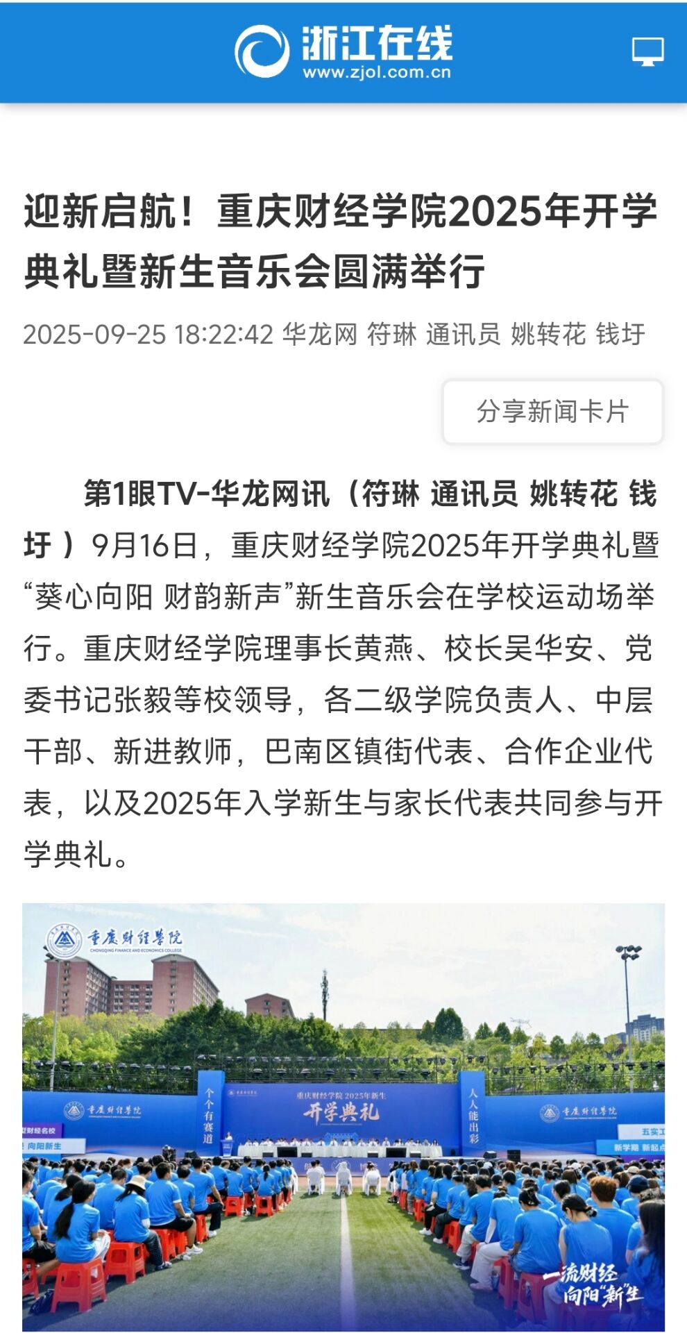 新征程鼓舞人心,新使命呼唤担当。重庆财经学院将以此次开学典礼为崭新起点,始终坚守立德树人初心,持续完善“三全育人”格局,拓宽多元成才路径,助力每一位学子在“个个有赛道、人人能出彩”的育人环境中茁壮成长,为培养更多担当民族复兴大任的时代新人贡献重财力量。