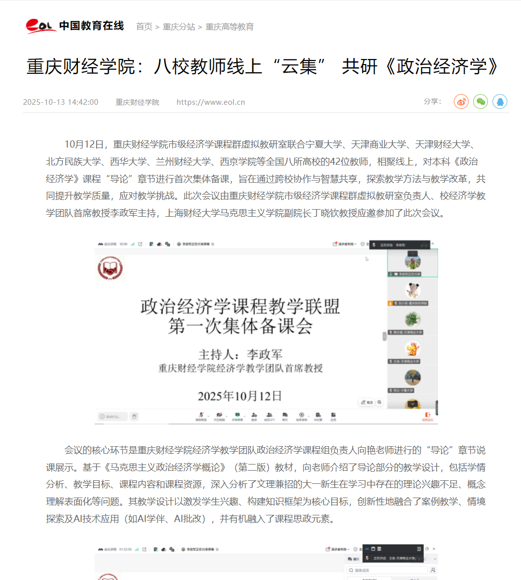 10月12日,重庆财经学院市级经济学课程群虚拟教研室联合宁夏大学、天津商业大学、天津财经大学、北方民族大学、西华大学、兰州财经大学、西京学院等全国八所高校的42位教师,相聚线上,对本科《政治经济学》课程“导论”章节进行首次集体备课,旨在通过跨校协作与智慧共享,探索教学方法与教学改革,共同提升教学质量,应对教学挑战。此次会议由重庆财经学院市级经济学课程群虚拟教研室负责人、校经济学教学团队首席教授李政军主持,上海财经大学马克思主义学院副院长丁晓钦教授应邀参加了此次会议。