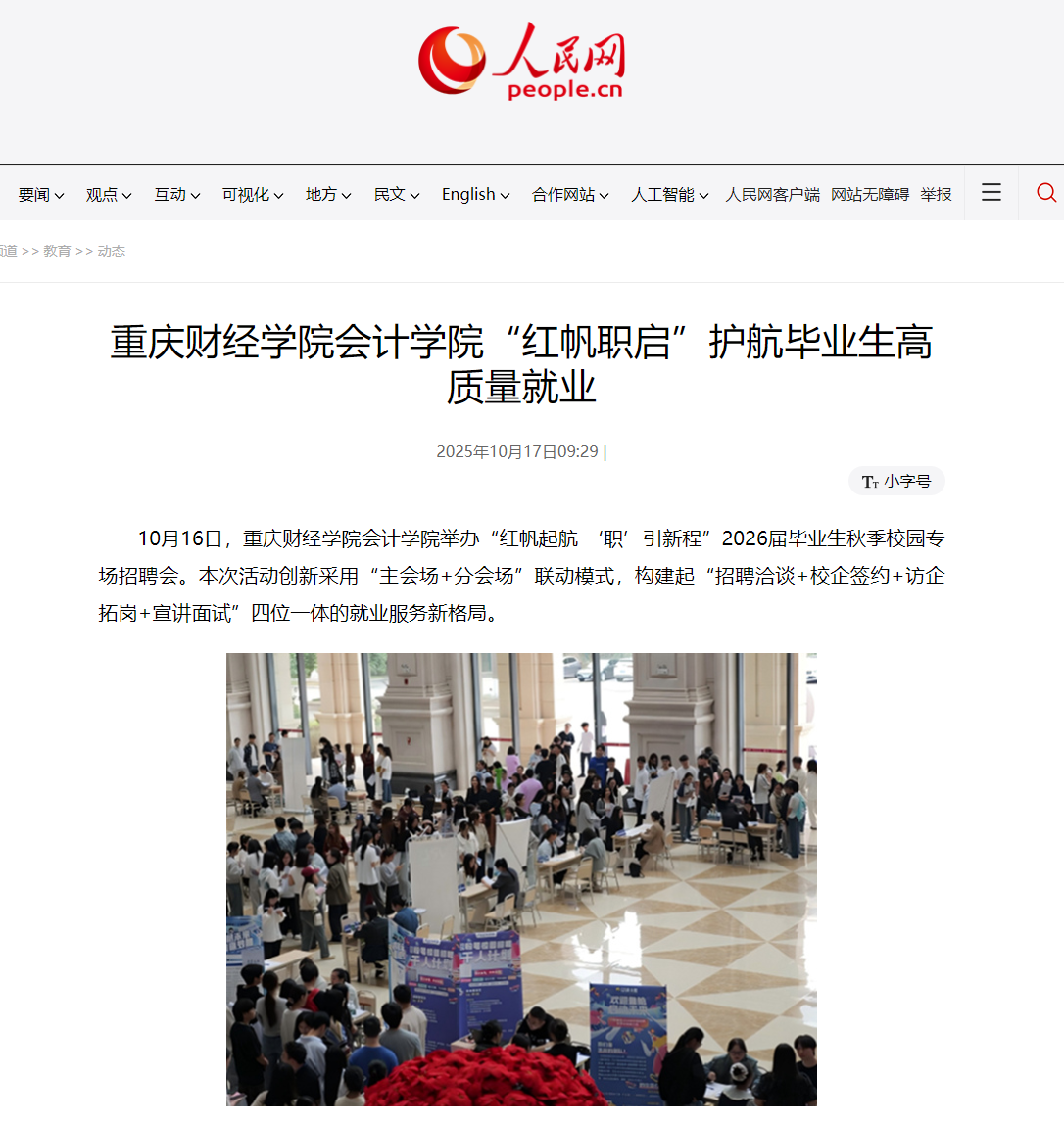10月16日,重庆财经学院会计学院举办“红帆起航 ‘职’引新程”2026届毕业生秋季校园专场招聘会。本次活动创新采用“主会场+分会场”联动模式,构建起“招聘洽谈+校企签约+访企拓岗+宣讲面试”四位一体的就业服务新格局。
