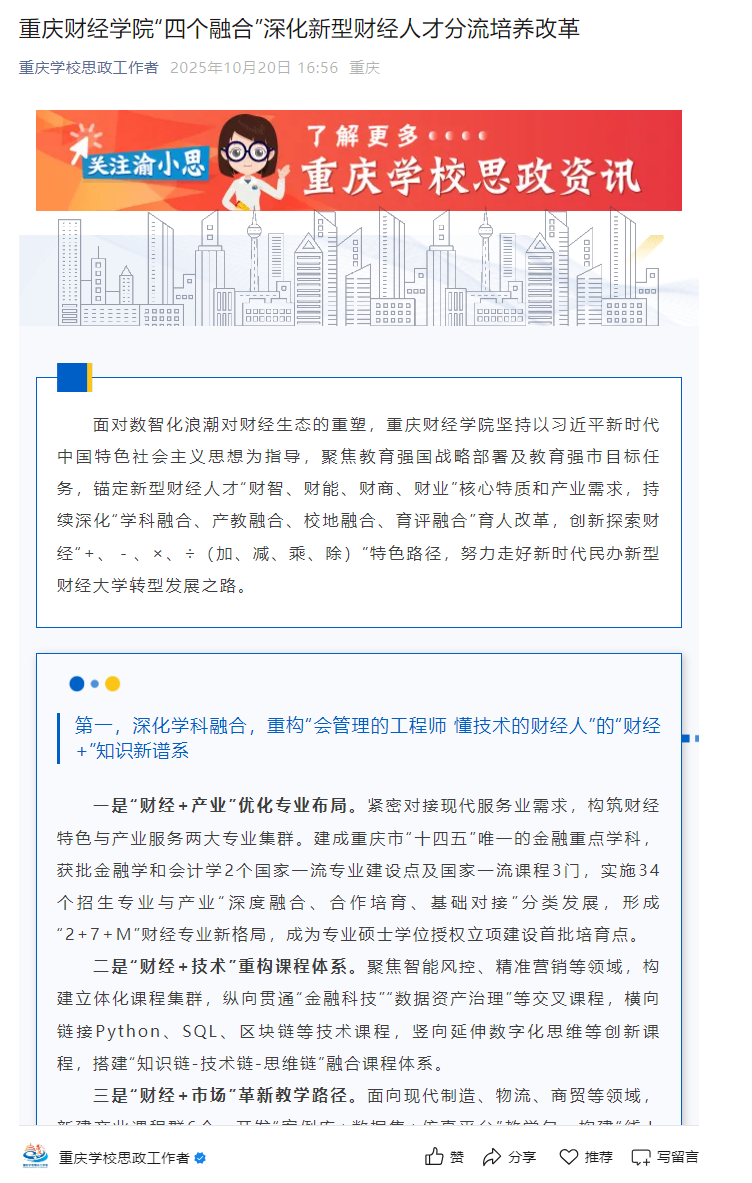 面对数智化浪潮对财经生态的重塑,重庆财经学院坚持以习近平新时代中国特色社会主义思想为指导,聚焦教育强国战略部署及教育强市目标任务,锚定新型财经人才“财智、财能、财商、财业”核心特质和产业需求,持续深化“学科融合、产教融合、校地融合、育评融合”育人改革,创新探索财经“+、-、×、÷(加、减、乘、除)”特色路径,努力走好新时代民办新型财经大学转型发展之路。