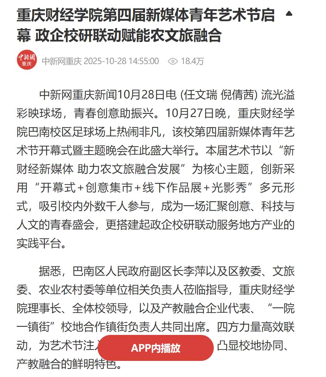 该校相关负责人表示,本届艺术节构建的“四方联动”模式,其核心精髓在于打破传统上各方相对独立的运作状态,将多方优势资源在一个开放、共享的平台上进行高效整合与精准对接。对正推进“数字文旅试验区”建设的巴南区而言,重庆财经学院提供了重要的智力支持和创意源泉;对学生而言,艺术节成为连接理论教学与产业实践的重要平台;对合作乡镇与农企而言,则获得了接地气、高效率的品牌推广渠道。这种创新模式将各方资源“拧成一股绳”,形成推动农文旅融合与乡村振兴的强大合力。