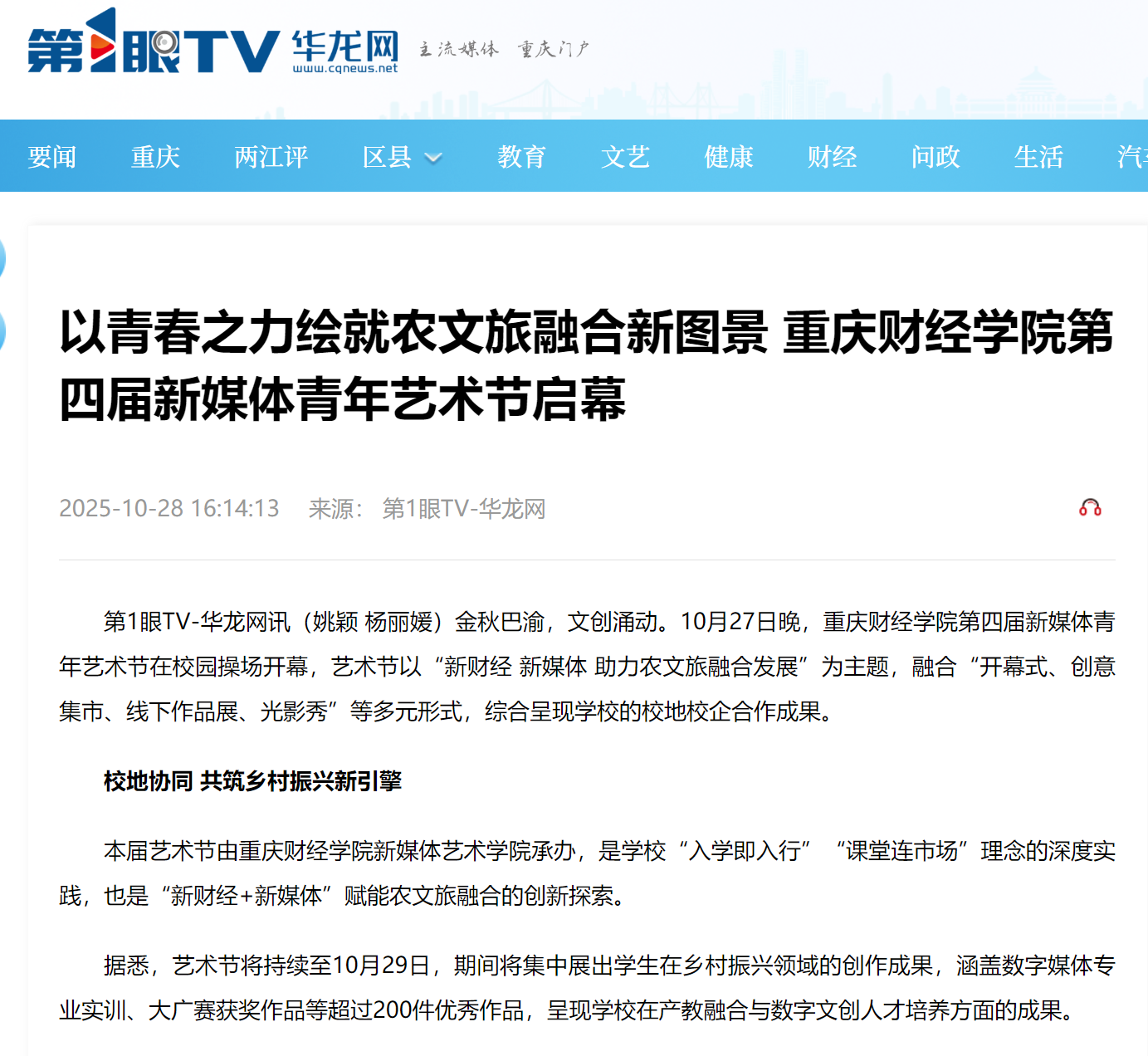 10月27日,重庆财经学院第四届新媒体青年艺术节在巴南校区开幕。本届艺术节以“新财经+新媒体”深度融合为特色,为期三天,通过政、校、企、研“四方联动”的创新模式,搭建起一座服务地方农文旅产业发展的“青春桥梁”,展现高校在服务社会与推动产教协同中的积极作为。