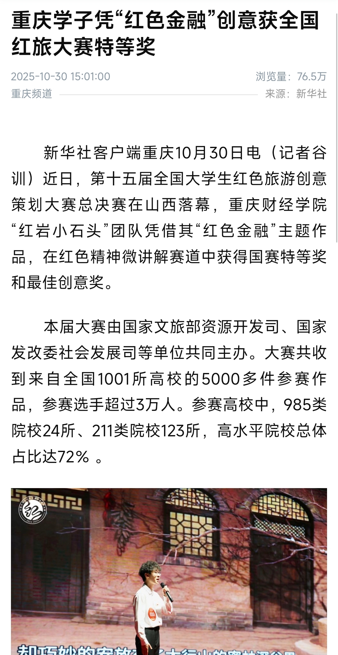 新华社客户端重庆10月30日电(记者谷训)近日,第十五届全国大学生红色旅游创意策划大赛总决赛在山西落幕,重庆财经学院“红岩小石头”团队凭借其“红色金融”主题作品,在红色精神微讲解赛道中获得国赛特等奖和最佳创意奖。