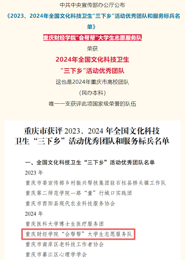 近日,中共中央宣传部办公厅公布《2023、2024年全国文化科技卫生“三下乡”活动优秀团队和服务标兵名单》。重庆财经学院“会帮帮”大学生志愿服务队荣获2024年全国文化科技卫生“三下乡”活动优秀团队,这也是2024年重庆市高校团队(民办本科)唯一一支获评此项国家级荣誉的队伍