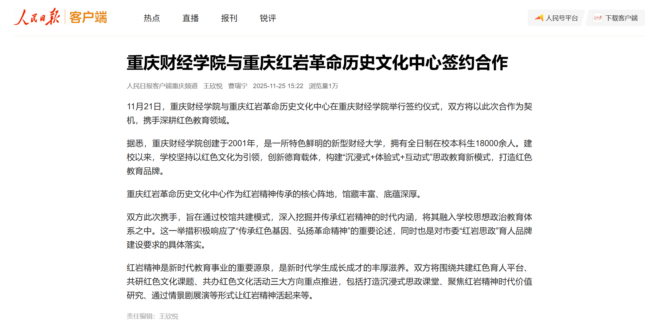 红岩精神是新时代教育事业的重要源泉,是新时代学生成长成才的丰厚滋养。双方将围绕共建红色育人平台、共研红色文化课题、共办红色文化活动三大方向重点推进,包括打造沉浸式思政课堂、聚焦红岩精神时代价值研究、通过情景剧展演等形式让红岩精神活起来等。