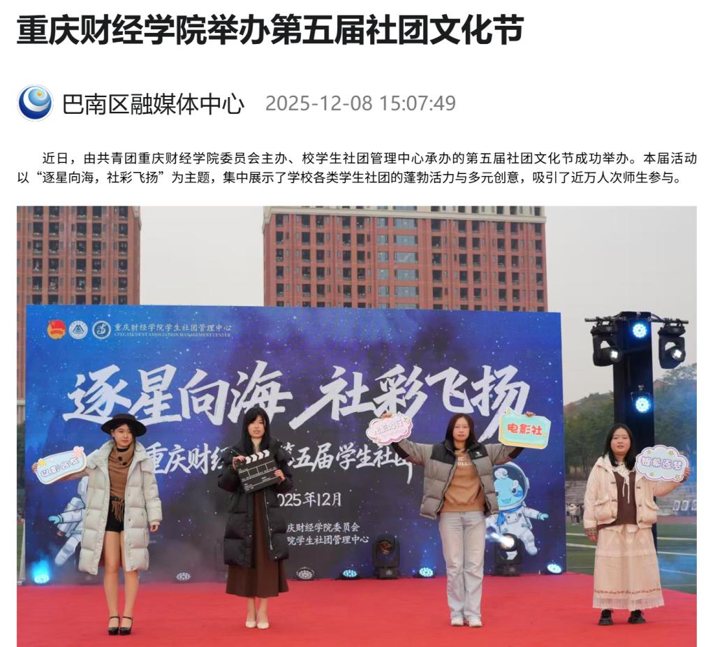 近日,由共青团重庆财经学院委员会主办、校学生社团管理中心承办的第五届社团文化节成功举办。本届活动以“逐星向海,社彩飞扬”为主题,集中展示了学校各类学生社团的蓬勃活力与多元创意,吸引了近万人次师生参与。