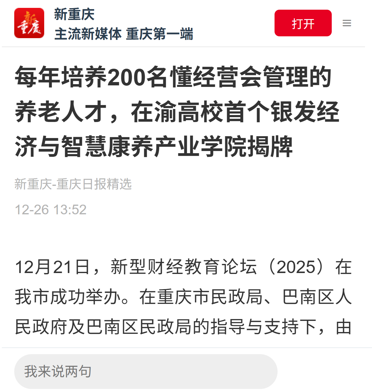 据悉,这是重庆市高校中首个聚焦银发经济与智慧康养领域的产业学院。学院将充分发挥高校与行业资源优势,每年定向培养约200名兼具经营管理能力与实践技能的应用型养老人才。未来,产业学院将重点开展养老机构推荐、老年产品甄选、旅居康养等服务,积极推动全市银发经济高质量发展,助力构建多层次、智能化的养老服务体系。
