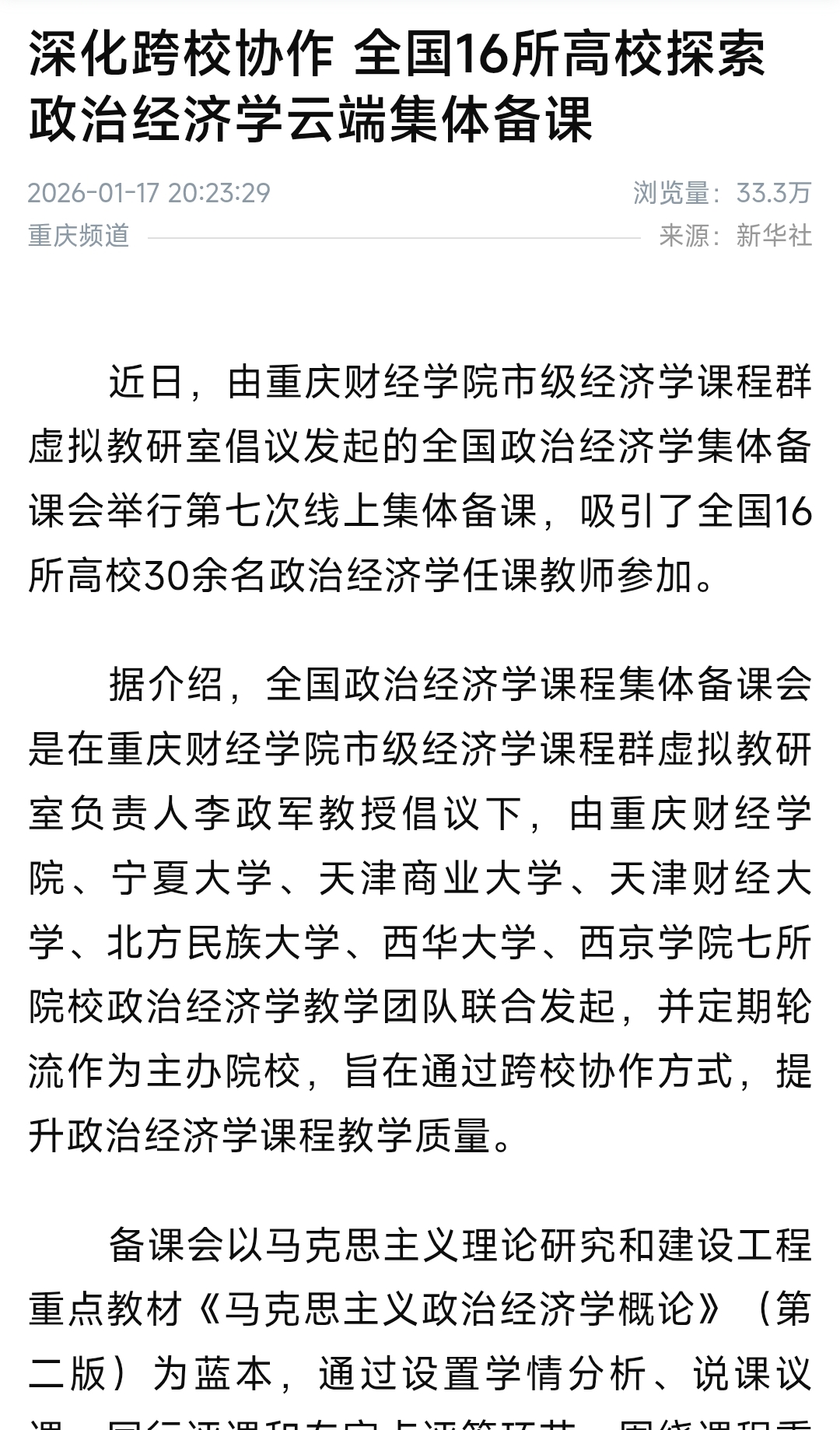 自2025年10月首次举办以来,全国政治经济学课程集体备课会已连续开展7期。参与高校数量由最初的7所扩大至16所,除重庆财经学院外,还包括天津大学、宁夏大学、天津师范大学、兰州财经大学、西北民族大学、郑州商学院、南京师范大学商学院等高校。
