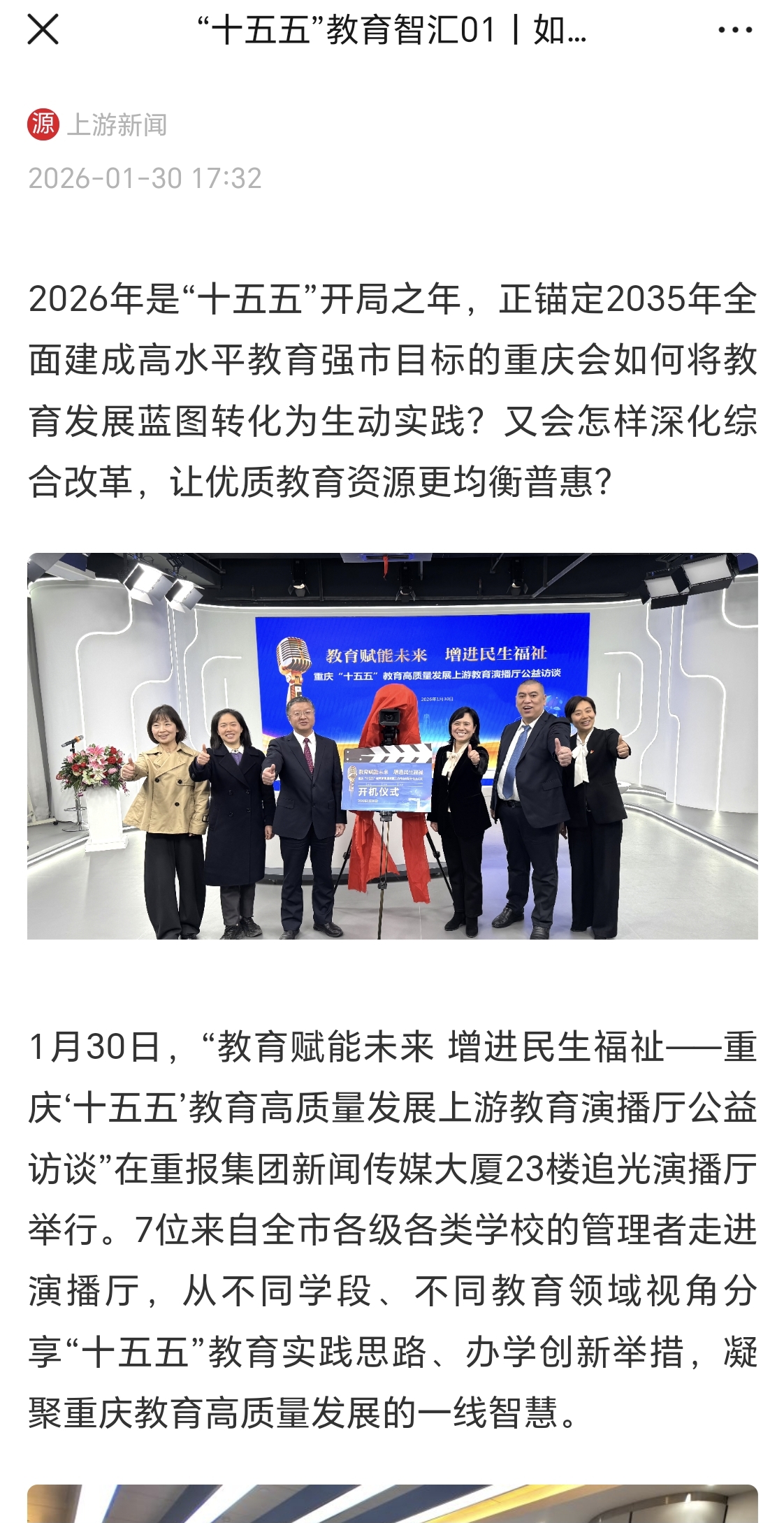 1月30日,“教育赋能未来增进民生福祉——重庆‘十五五’教育高质量发展上游教育演播厅公益访谈”在重报集团新闻传媒大厦23楼追光演播厅举行。7位来自全市各级各类学校的管理者走进演播厅,从不同学段、不同教育领域视角分享“十五五”教育实践思路、办学创新举措,凝聚重庆教育高质量发展的一线智慧。