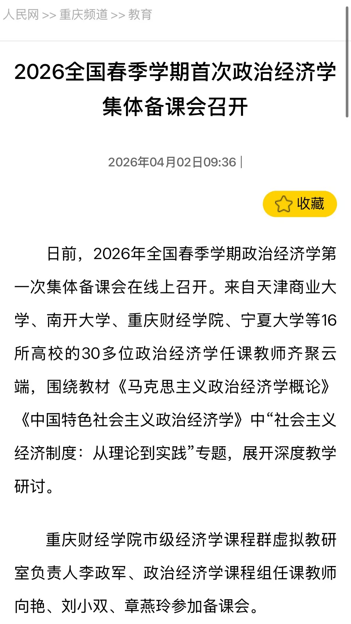 日前,2026年全国春季学期政治经济学第一次集体备课会在线上召开。来自天津商业大学、南开大学、重庆财经学院、宁夏大学等16所高校的30多位政治经济学任课教师齐聚云端,围绕教材《马克思主义政治经济学概论》《中国特色社会主义政治经济学》中“社会主义经济制度:从理论到实践”专题,展开深度教学研讨。