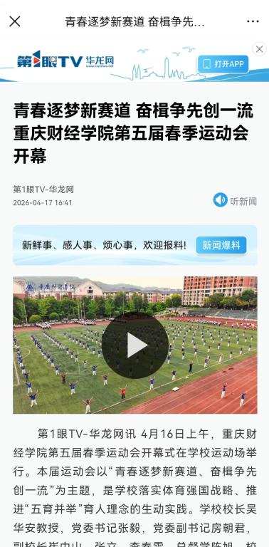 4月16日上午,重庆财经学院运动场上旗帜飞扬,呐喊声、加油声此起彼伏,第五届春季运动会拉开帷幕。这场以“青春逐梦新赛道、奋楫争先创一流”为主题的体育盛会,也成为学校落实体育强国战略、推进“五育并举”的生动实践。