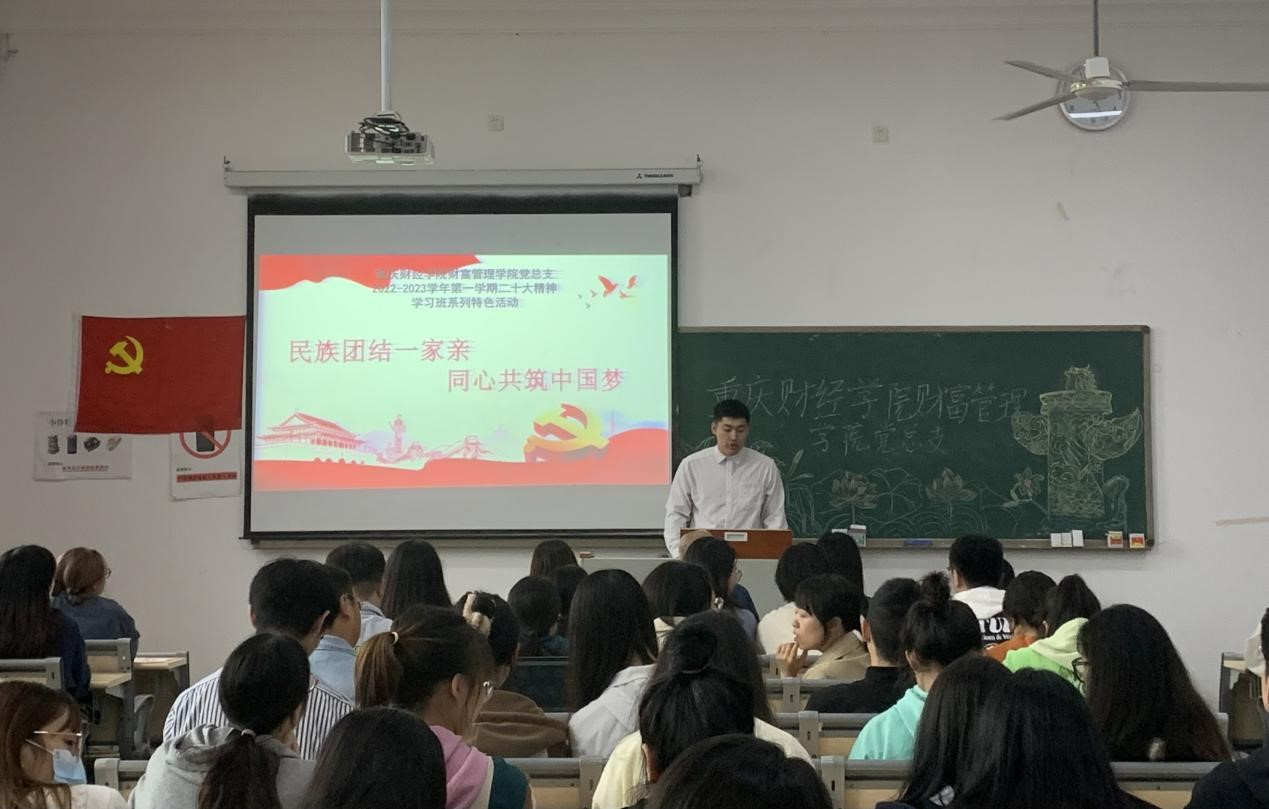 为深入贯彻学习二十大精神内容,凝聚民族团结磅礴力量,铸牢全体师生党员共同体意识。重庆财经学院财富管理学院党总支于2022年10月28日下午开展以“民族团结一家亲,同心共筑中国梦”为主题的二十大精神学习班系列特色活动。财富管理学院书记兼院长贺高祥、党总支副书记宋钰静、院长助理廉然、学团办副主任陈晨、学生党支部书记赵诗琪、全体教师党员以及学生党员参加本次活动。