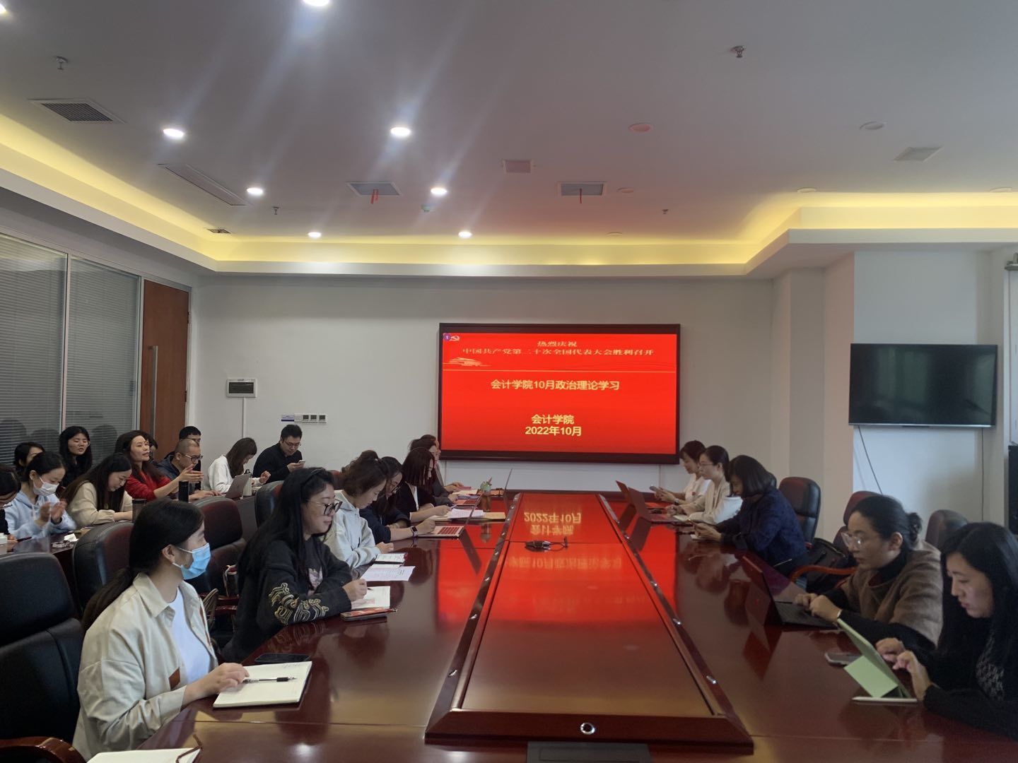 为深入学习贯彻党的二十大精神,激发会计学院全体教师及学生党员奋进新时代的磅礴力量。会计学院全体教师、学生党员分别于10月17日、20日通过线上线下相结合的方式学习党的二十大精神。会计学院党总支书记姚转花、副院长李倩、学生党支部一支部书记阳圆、二支部书记李萍以及全体教师、学生党员共同参加本次专题学习。
