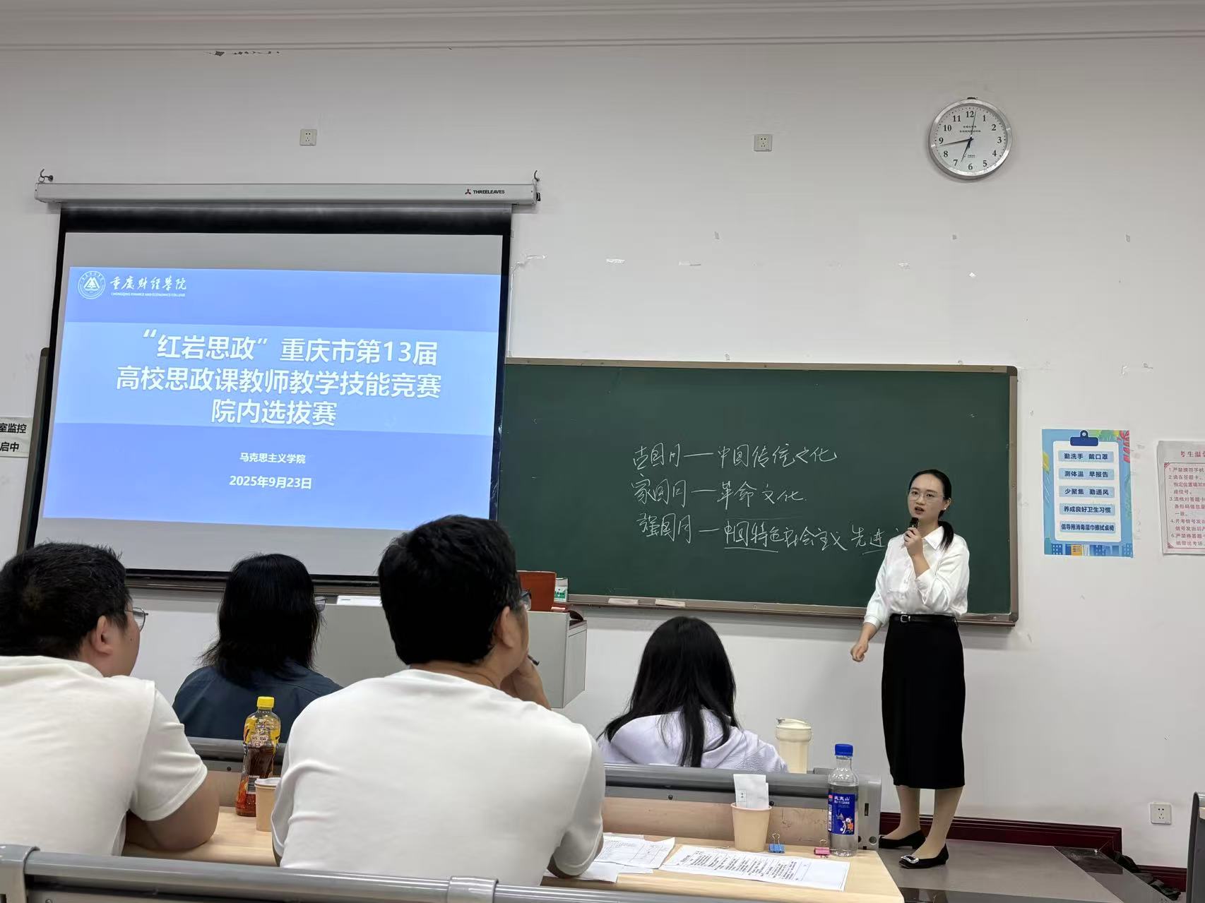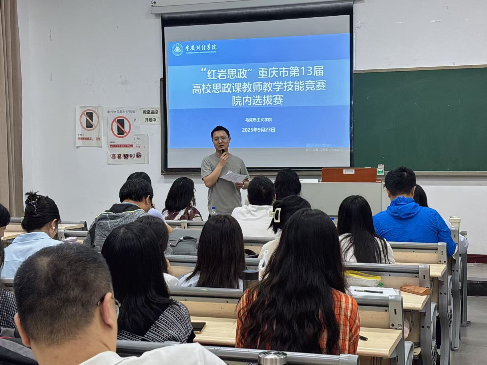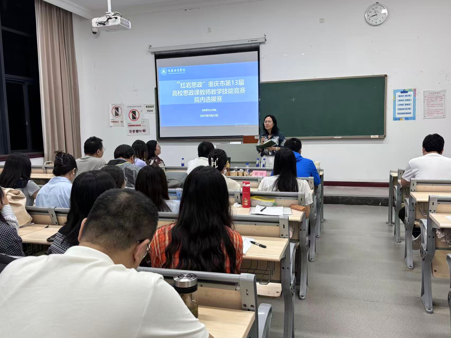 为深入学习贯彻党的二十大和二十届三中全会精神,贯彻落实习近平总书记在全国教育大会上的重要讲话以及关于学校思政课建设的重要指示精神,落实全市教育大会和新时代学校思政课建设推进会精神,以赛促训、以赛促学、以赛促学、以赛促教,着力建设一支政治强、情怀深、思维新、视野广、自律严、人格正的思政课教师队伍。9月23日,马克思主义学院在教学楼1523与1521同步举办了“红岩思政”重庆市第13届高校思政课教师教学技能竞赛校内初赛。本次比赛分为教师甲组和教师乙组,全体思政课专职教师参与,教务处副处长陈晴、马克思主义学院院长常晓薇、马克思主义学院党总支副书记崔文卿、副教授李佳以及各教研室主任担任本次比赛的评委。