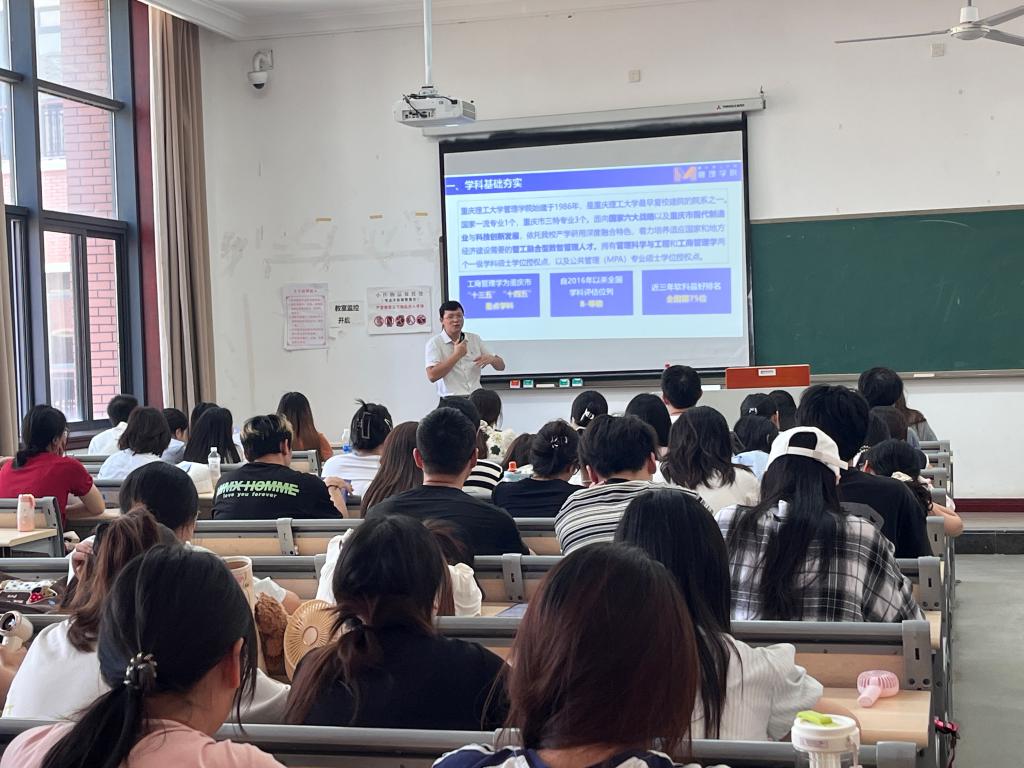 宣讲会上,副院长周林以“为什么读研”破题,从个人价值、知识结构、职业发展与时代机遇四维度阐释读研意义,鼓励学生将个人成长融入国家发展需要。在随后的“学校概况”与“学院简介”环节,他系统介绍了重庆理工大学作为工科优势突出的市属重点大学的办学实力,并着重展示了管理学院在师资力量、科研成果与实践平台等方面的综合优势,凸显其培养创新型管理人才的坚实基础。