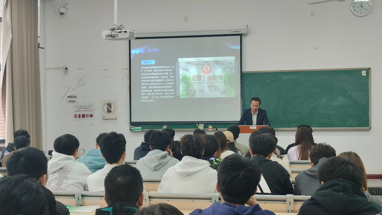 讲座中,李清帆经理结合自身在人力资源管理领域的丰富经验,系统剖析了工程行业的发展趋势与人才需求特征,通过真实案例阐释了“专业能力、沟通协调与职业韧性”在个人成长中的关键作用。同时,基于工程行业数字化转型与全过程管理的新趋势,李经理结合四川金朋工程管理咨询有限责任公司的实际项目案例,深入剖析了当前行业对工程管理人才的核心素养要求。他提出,现代工程管理人才需具备“技术扎实、管理精通、视野全面” 的复合能力结构,并特别强调了数字化工具应用能力(如BIM、项目管理软件)、跨领域协同能力以及可持续发展理念在工程实践中的重要性。随着工程管理行业向全过程、集成化服务模式转型,企业对人才的要求已从单一技能拓展至项目全生命周期管理的综合素质。他鼓励学生不仅要夯实工程技术、经济管理与法律法规等专业基础,还需在校园阶段积极培养数据思维、风险意识与沟通协调能力,以适应行业对“懂技术、善管理、通法律”的高素质应用型人才的迫切需求。同学们纷纷表示,通过本次讲座对行业生态与职业发展路径有了更清晰的认识,也对专业学习与能力积累有了更明确的方向。