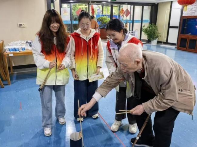 步入活动区,另一番温馨场景正在展开。志愿者们专注地操作着棉花糖机,只见砂糖在机器中缓缓融化,抽出千丝万缕的糖絮。他们熟练地转动竹签,不一会儿,一团团蓬松柔软的“云朵”便在巧手中诞生。志愿者们弯下腰,小心翼翼地将这份甜蜜递到每位老人手中。投壶区内欢声不断,他们细心指导握箭姿势,每当箭矢入壶,老爷爷与志愿者相视而欢笑声朗朗。