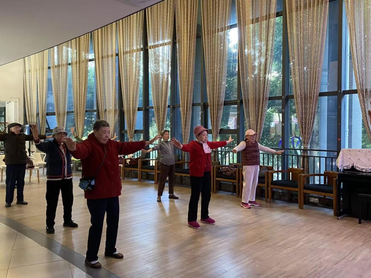 | (图3 志愿者陪伴老人们练习八段锦) |