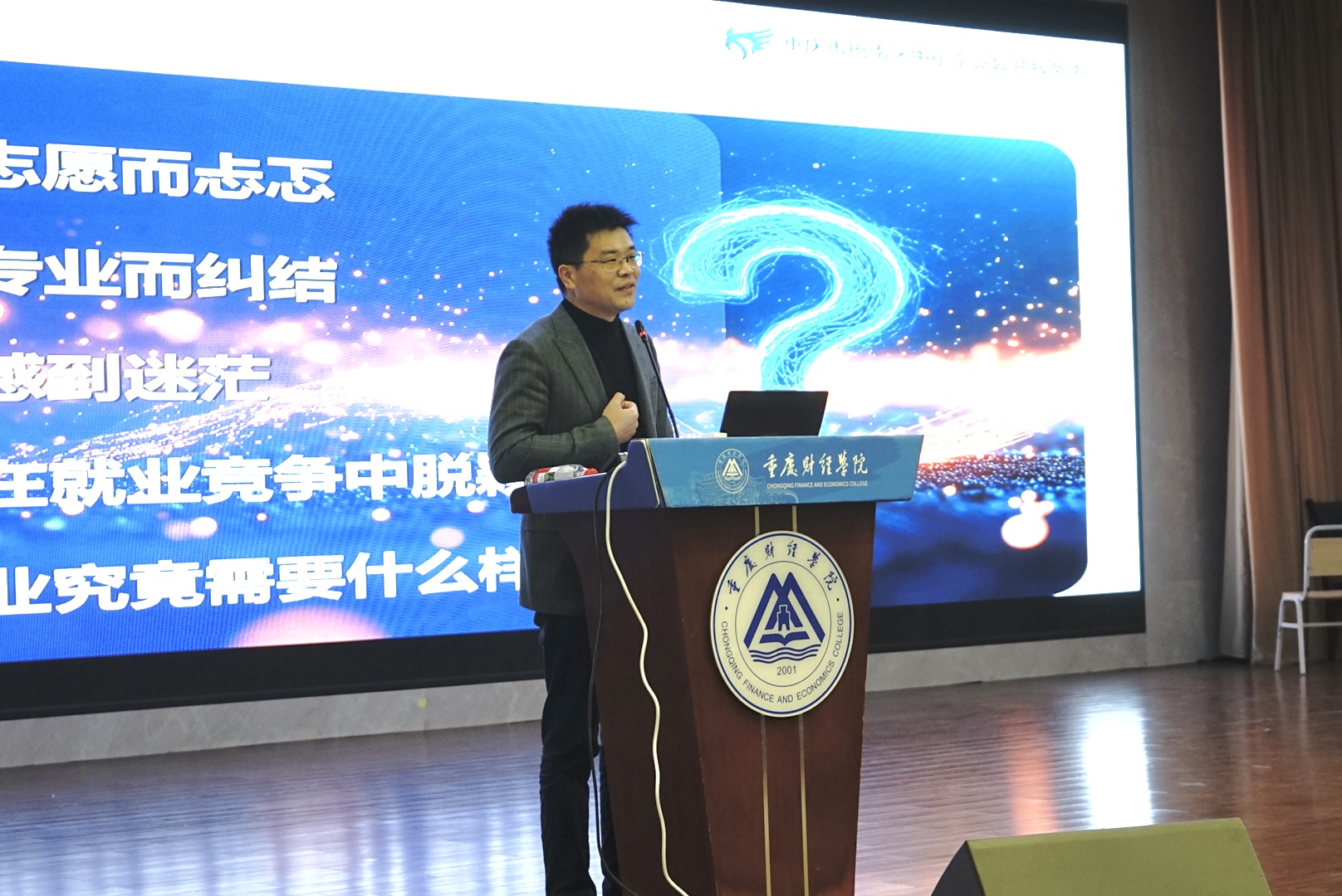 为助力2025级新生在学业起点锚定发展方向,提升自我发展能力,实现“个个有赛道,人人能出彩”的培养目标,2025年11月26日中午,经济学院在学术报告厅开展“规划现在,赢取未来——大学生职业生涯规划”专题讲座。本次讲座由经济学院院长宋湘琴主持,特邀顾迪集团联合创始人、重庆市巴南区中小企业公共服务中心主任、重庆士继嘉知识产权研究院执行院长甘国平担任主讲,学院2025级全体新生参加。