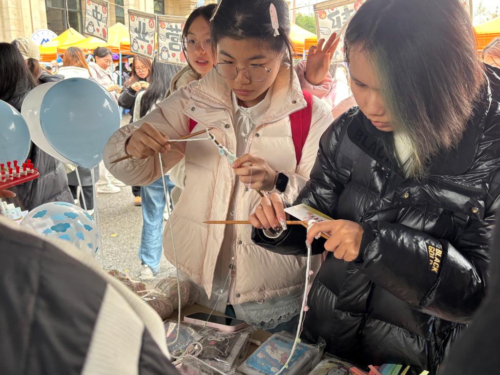 活动围绕“暖冬志愿·指尖传情”主题,设置了三大趣味挑战环节。在“袋袋相传·手速大挑战”中,同学们双手交替抛接塑料袋,场面欢快,完成连续抛接者兴奋欢呼;“校园盲盒·善意漂流”环节,同学们将写有暖心寄语的小物件封装成盲盒,传递“致陌生的你”的无声善意;在“指尖织趣·点位打卡”处,即使是零基础的同学也互相请教针法,在编织过程中洋溢着笑容与成就感。现场还设有通关奖励:完成两项挑战可抽取实用盲盒,全部通关则获得暖宝宝礼品。整场活动在轻松愉快的互动中,让“奉献、友爱”的志愿精神在冬日校园中生动传递。