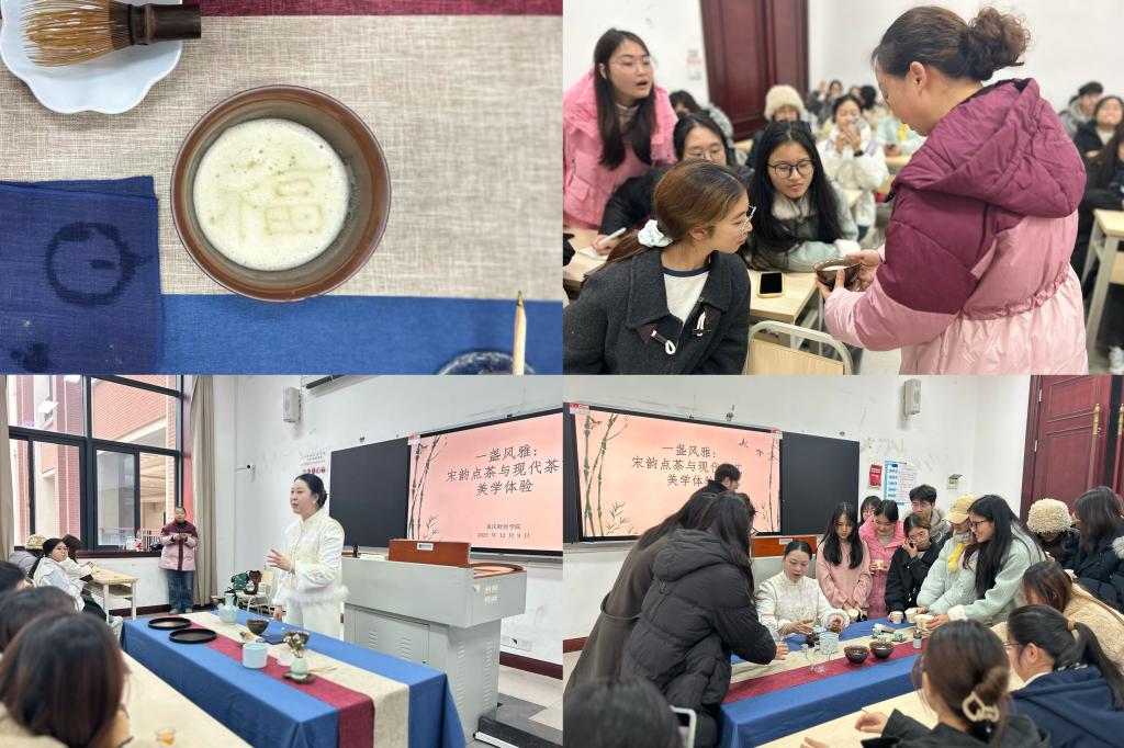 当天下午,学院邀请同庆茶叶坊的彭燕燕和蒋亚莉两位茶艺师为学生们带来“一盏风雅:宋韵点茶与现代茶艺美学体验”双创实践美育活动。