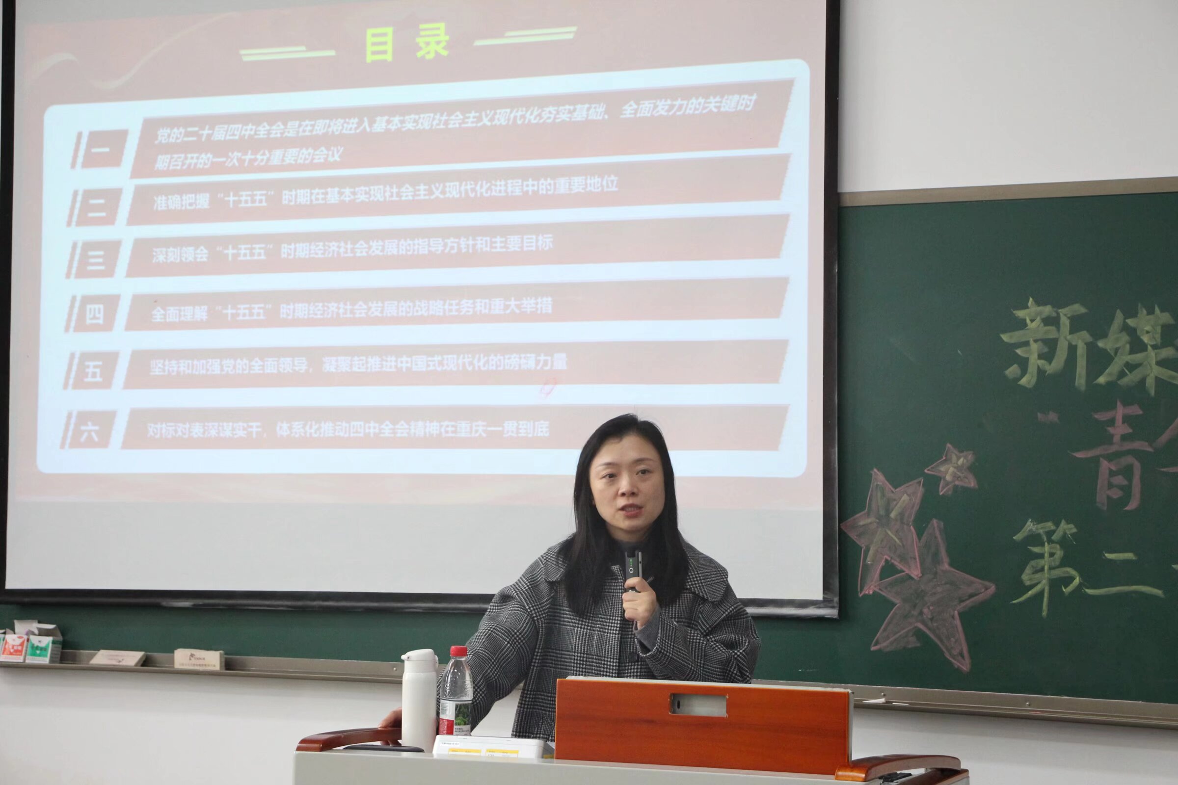 为深入学习贯彻党的二十届四中全会精神,筑牢青年学子思想根基,12月17日,我校新媒体艺术学院第六期“青年马克思主义者培养工程”(以下简称“青马工程”)第二讲在教学楼1601教室顺利举行。学校党委委员、学院党总支书记倪倩茜应邀作主题宣讲,团总支书记朱明明出席活动,第六期全体“青马工程”学员参加学习。