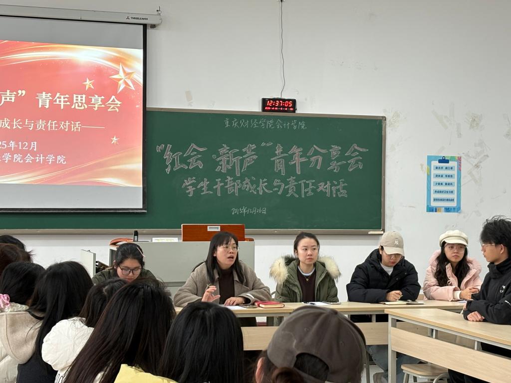 为搭建青年学生骨干交流平台,凝聚成长共识,强化责任担当,践行学校“个个有赛道,人人能出彩”的育人理念,2025年12月26日,会计学院在教室1611顺利举办“红会・新声”青年思享会。会计学院党总支书记宋钰静、学生第一党支部书记黄洁出席活动,会计学院党员服务站、团学及融媒体中心负责人、“会”创团队成员参加此次思享会。