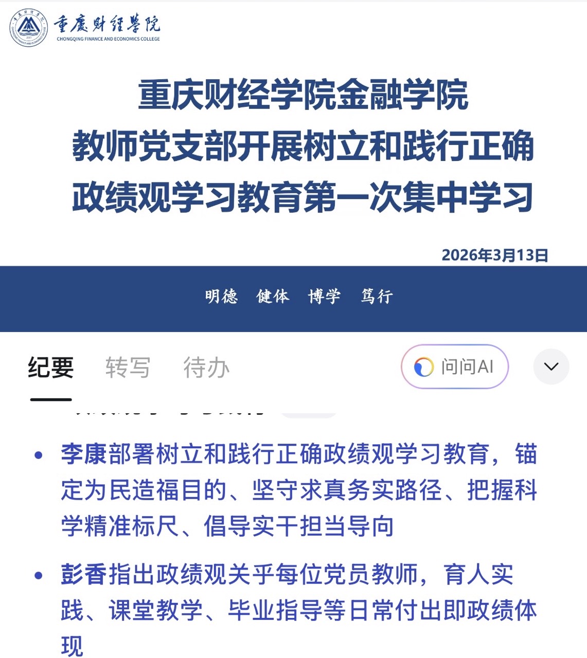 树立和践行正确政绩观学习教育丨金融学院党总支召开树立和践行正确政绩观学习教育启动会暨第一次集中学习