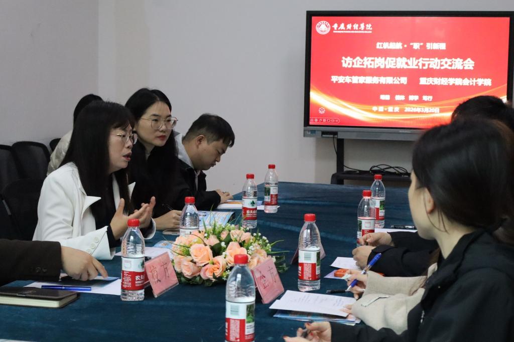为深入贯彻就业优先战略,拓宽毕业生高质量就业渠道,深化校企协同育人机制,3月20日,会计学院与平安车管家服务有限公司在图书馆大研讨室举行“红帆起航·‘职’引新程”访企拓岗专项行动交流会。平安车管家全国人力总监张帅及企业招聘团队代表,会计学院党总支书记宋钰静、副书记冉光波,学团办主任谭白冰、副主任陈晨,大四辅导员代表徐铭醴参加会议。双方围绕人才培养模式创新、校园招聘效能提升及未来合作方向展开深入务实的交流。