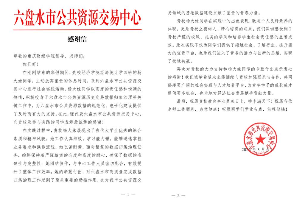 杨大妹同学通过参与档案归集整理工作,深刻感受到资料统一与归集的必要性。在纸质版资料的基础上,她归集整理出重要部分形成电子版,提高了查阅效率,使资料保存更加科学、便捷。此次实践让她接触到诸多专业新知识,丰富了认知视野,提升了实践操作能力,更在直面问题、解决问题的过程中实现了自我成长。近日,六盘水市公共资源交易中心向我院发来感谢信,对杨大妹同学在实践期间认真负责的工作态度和扎实的专业素养给予高度评价。这封感谢信既是对她个人努力的肯定,也体现了我院学子在基层岗位上以专业之能服务社会的责任与担当。