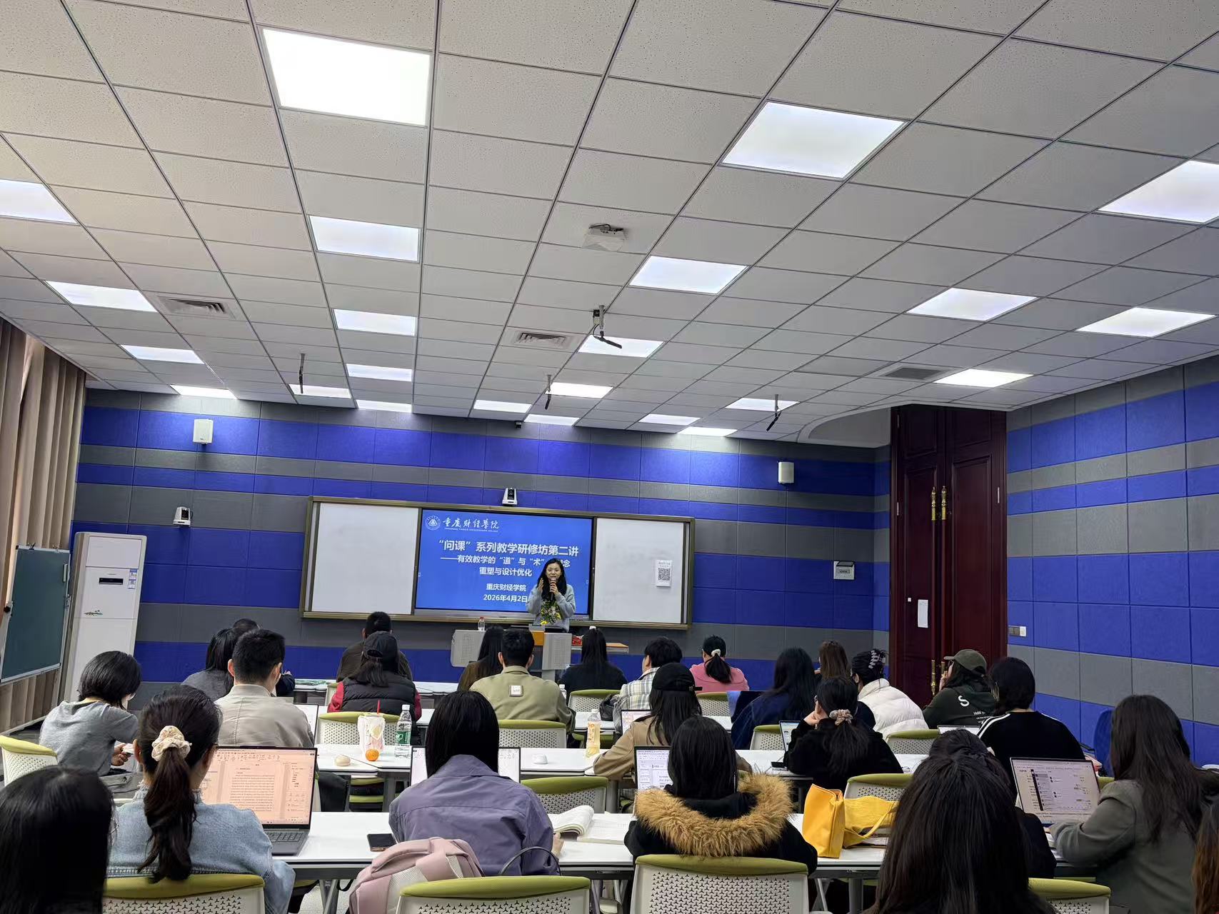 为助力青年教师更新教学理念、优化教学设计,提升课堂育人实效,2026年4月2日,教师发展中心在教学楼1220智慧教室举办“问课”系列教学研修坊第二讲。本次培训特邀周婧玥副教授主讲,主题为有效教学的“道”与“术”:理念重塑与设计优化,全校60余名教师参训学习。