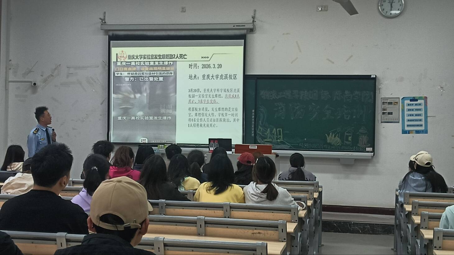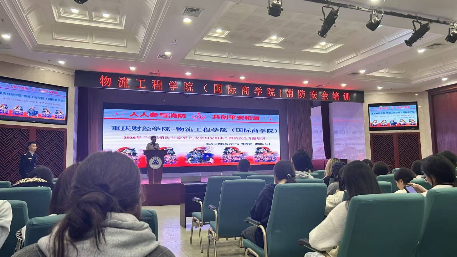 为切实提升物流工程学院(国际商学院)学生的消防安全意识与应急处置能力,筑牢学生宿舍安全防线,4月1日中午12:30,物流工程学院(国际商学院)联合重庆市利民防火中心,分别在学院报告厅、教学楼1306教室开展“人人参与消防,共创平安和谐”宿舍消防安全专题培训。学院党总支副书记王艺燃出席并讲话,重庆市利民防火中心韩教官、范老师担任主讲。