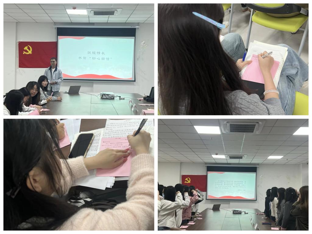 活动现场,公管青年学子首先集中观看了老党员(奶奶)的采访视频,视频中,奶奶结合自身数十年的入党历程与工作经历,深情讲述自己坚守初心、服务人民的峥嵘岁月,不仅为青年学子上了一堂生动鲜活、直击心灵的“初心党课”,还专门对公共管理学院的青年学子提出“听党话、做党事、跟党走”的殷切寄语。视频多角度捕捉奶奶诉说初心的深情瞬间,也定格现场学子认真聆听的专注模样,全方位、立体化展现活动温情氛围。尤为亮眼的是,这场“同龄对话”(指政治生命)极具视觉冲击力和故事感——80岁的老党员与20岁左右的青年学子,年龄相差60岁,却因共同的信仰实现了跨越时空的初心共鸣。深受触动的青年学子,在观看完视频后,纷纷拿起桌上整齐摆放的初心信纸,凝神聚力、笔耕不辍,认真写下对奶奶的回信,倾诉内心的感悟与敬意;随后,在学生支部书记王春凤的带领下,全体学子面向鲜红党旗庄严宣誓,铿锵有力的誓言回荡在活动现场,充分彰显了新时代青年的责任与担当。